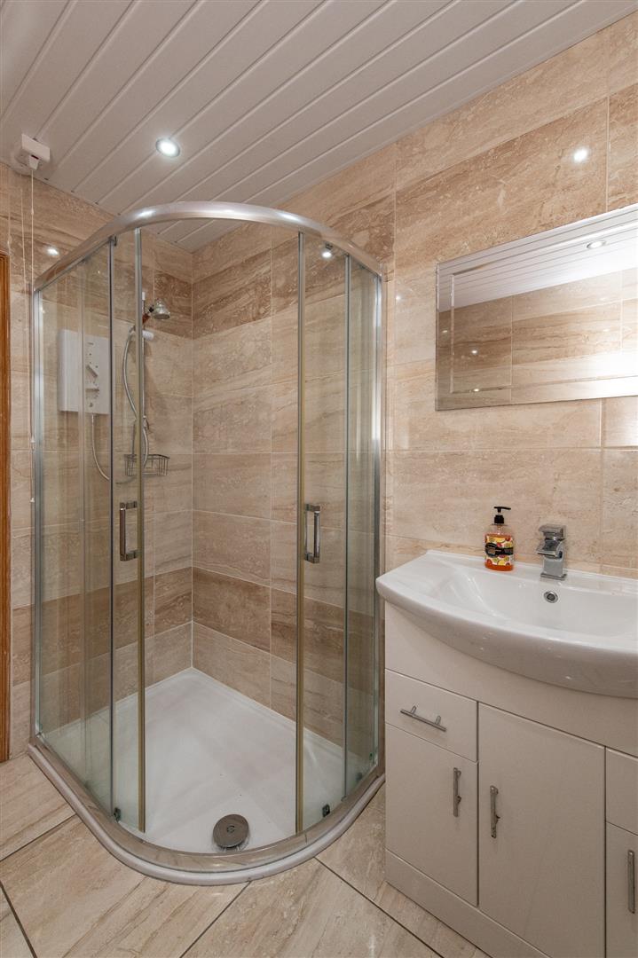 Modern suite comprising glazed shower cubicle, Mira electric shower, low flush W/C, vanity unit sink, wall tiling, ceramic tiled flooring, PVC panelled ceiling, downlighters, chrome heated towel rail