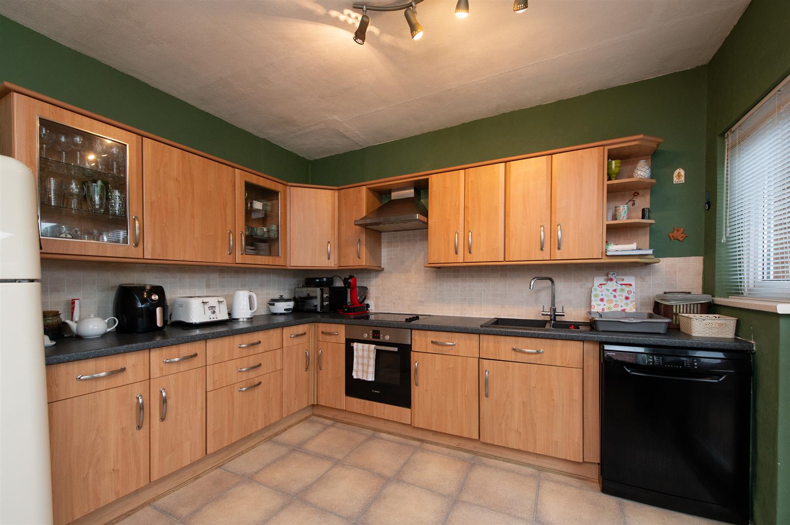 Range of high and low level units, round edge worksurfaces, built in stainless steel oven, inlaid hob, stainless steel extractor hood, uPVC back door, plumbed for washing machine, space for dishwasher, single drainer sink unit with mixer tap and vegetable sink, glazed display units