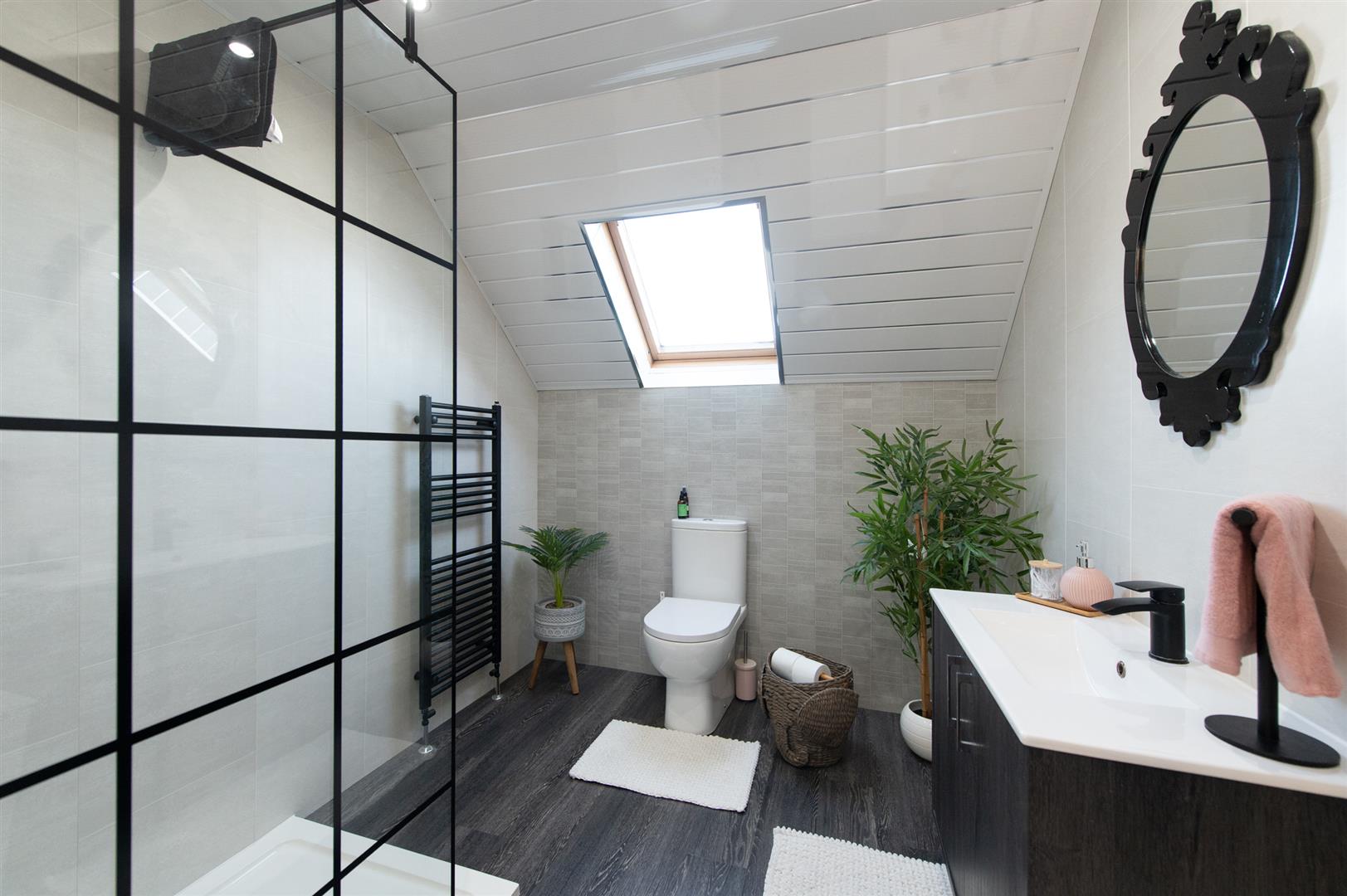 Low flush W/C, vanity unit with mixer tap, large walk in shower unit with rain shower and hand held shower attachment, uPVC panelling, heated towel rail, laminate wood flooring, Velux window, downlighters, extractor fan