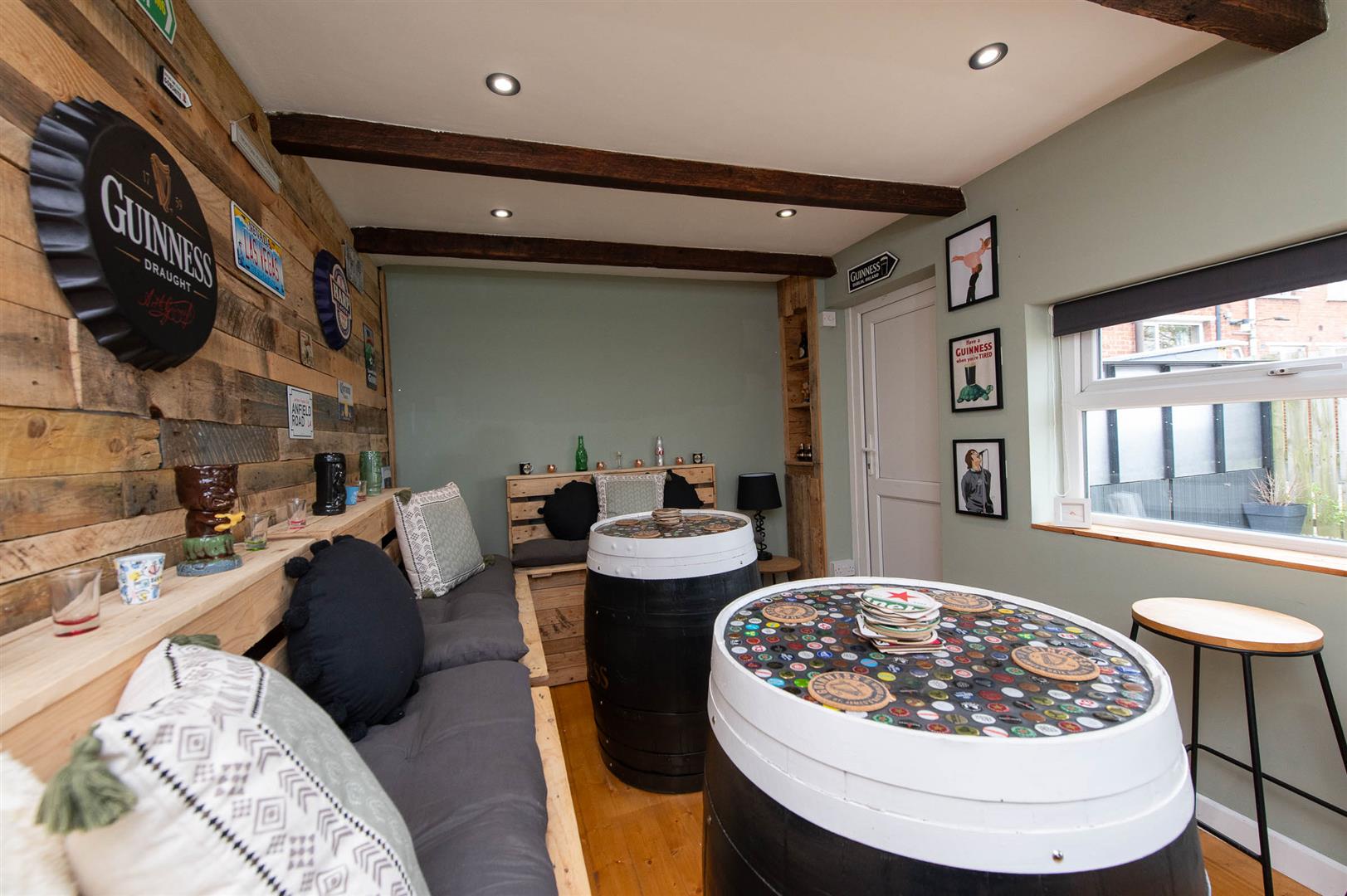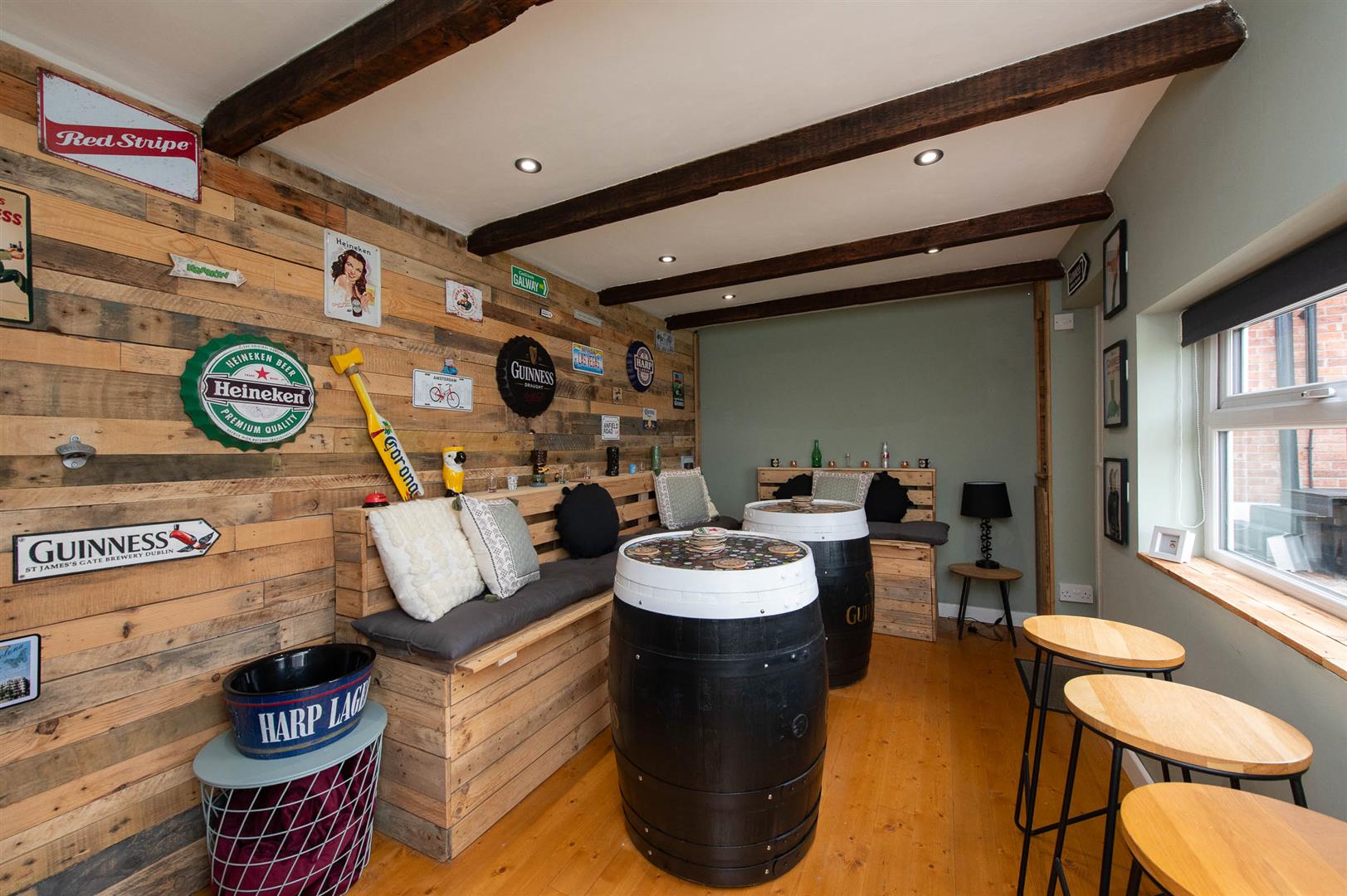 Rear: Raised feature composite decking area, glass veranda, external double electric socket and heater, in lawn, paved patio area, separate seating area with artificial grass, plants, shrubs, outside tap, outside light