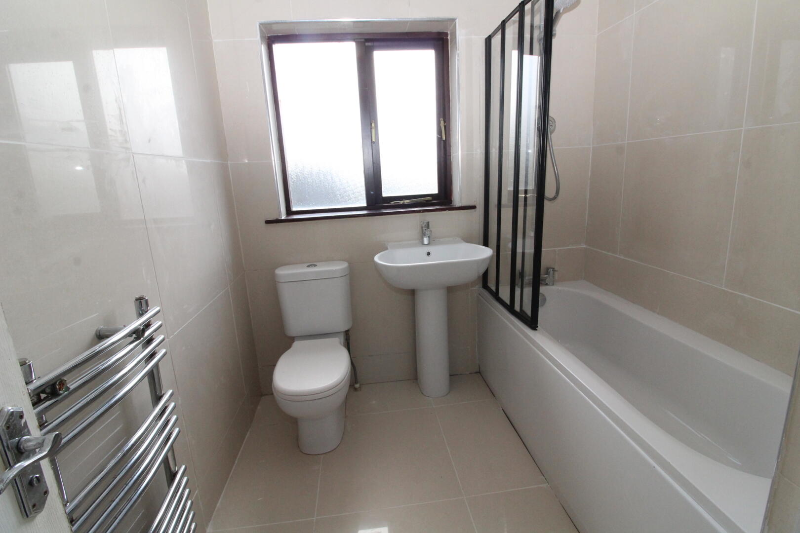 White suite comprising panelled bath, folding glazed shower screen, thermostatic controlled shower, low flush W/C, pedestal wash hand basin, fully tiled walls, polished porcelain tiled flooring, extractor fan, hot press with insulated copper cylinder