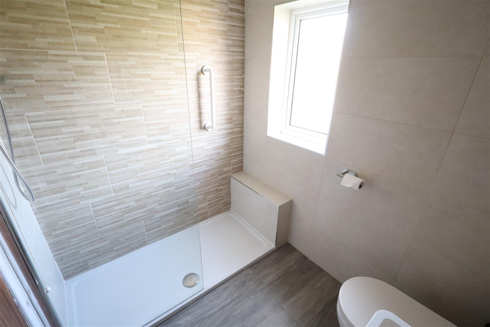 Shower unit with thermostatically controlled shower, glazed shower screen, low flush W/C, modern floating vanity sink unit with mixer taps, chrome heated towel rail, extractor fan, wall tiling