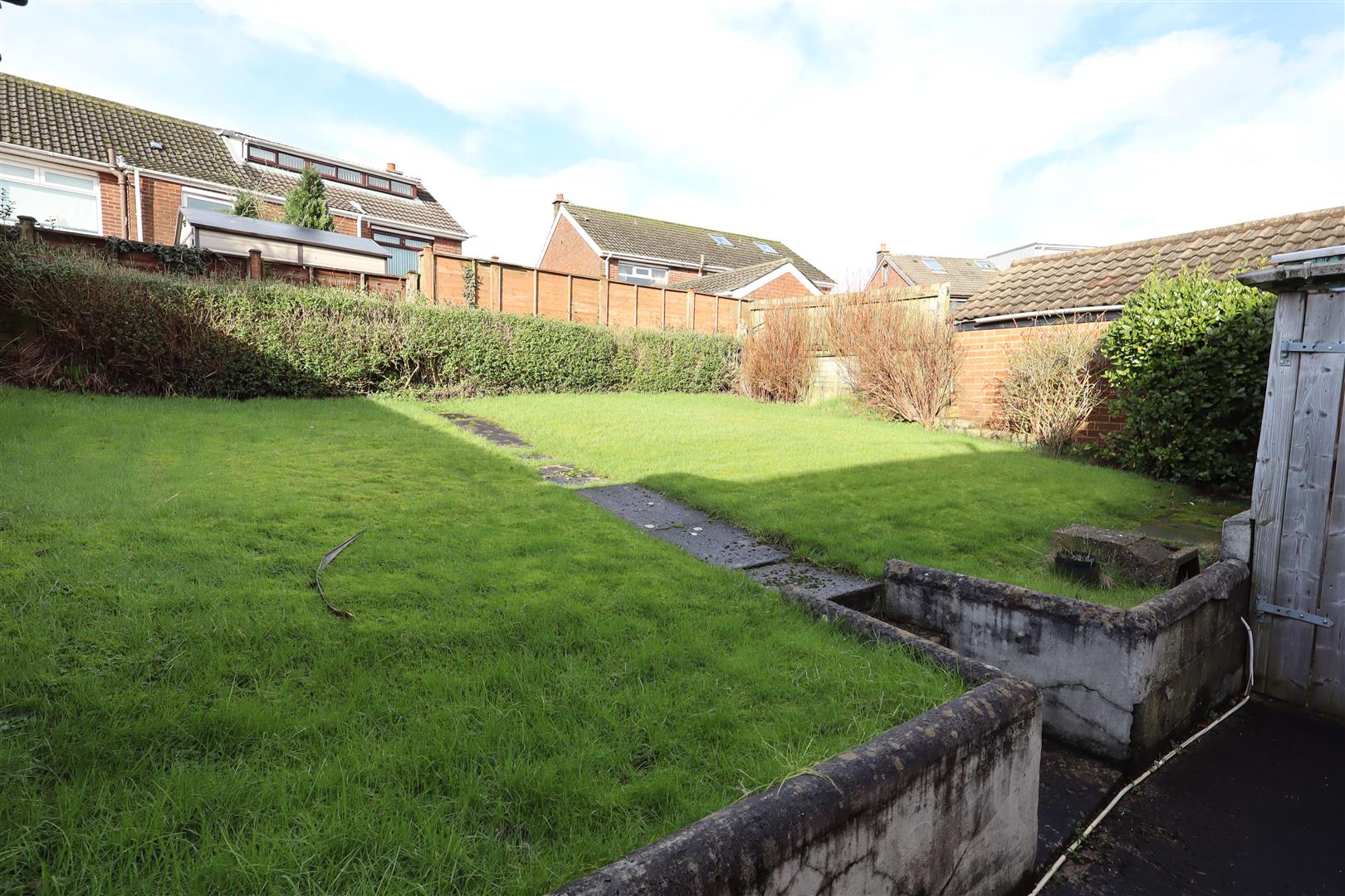 Front: In lawn, tarmacked driveway, plants and shrubs.