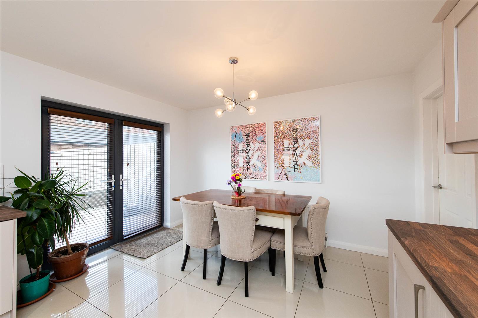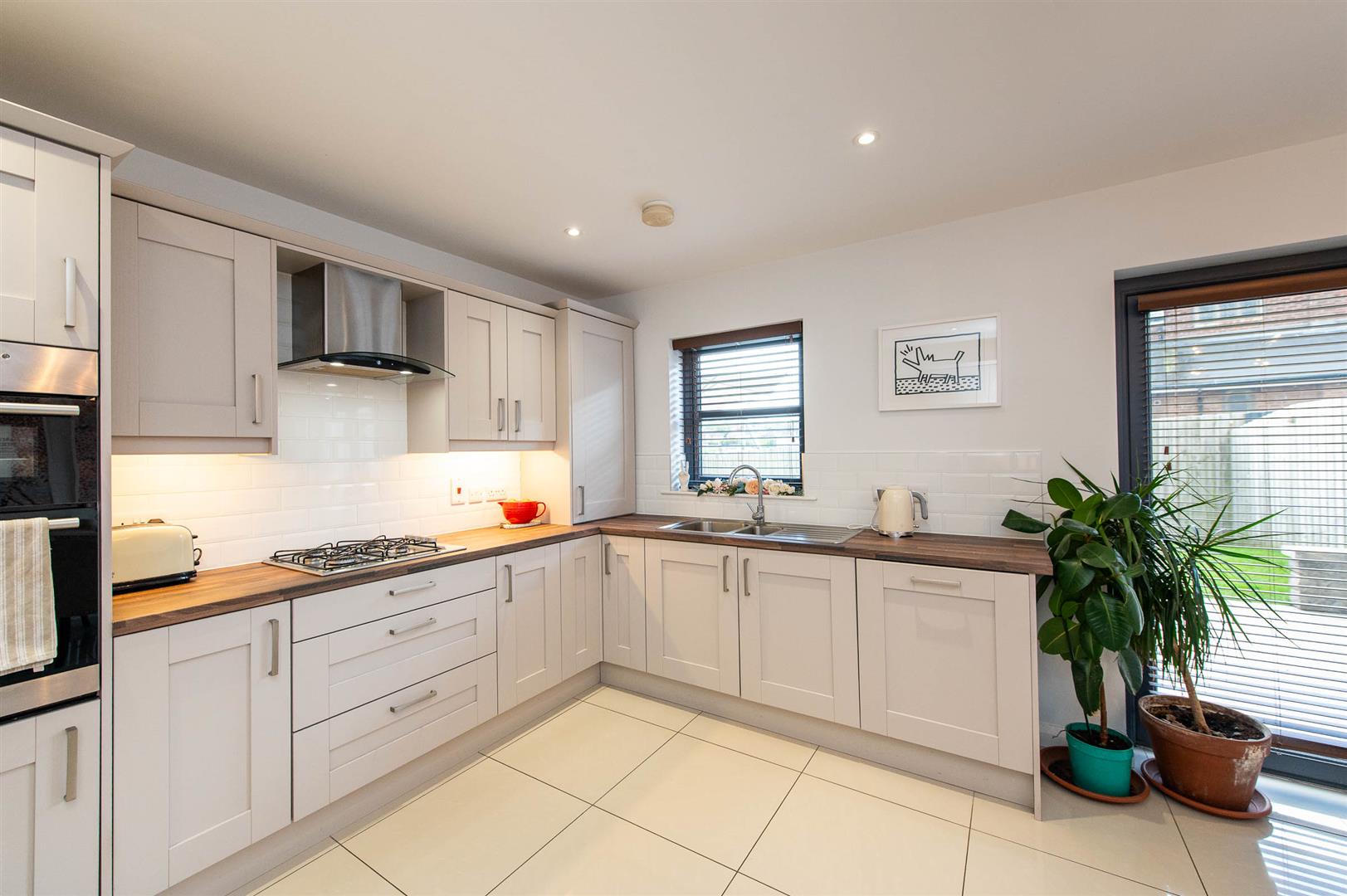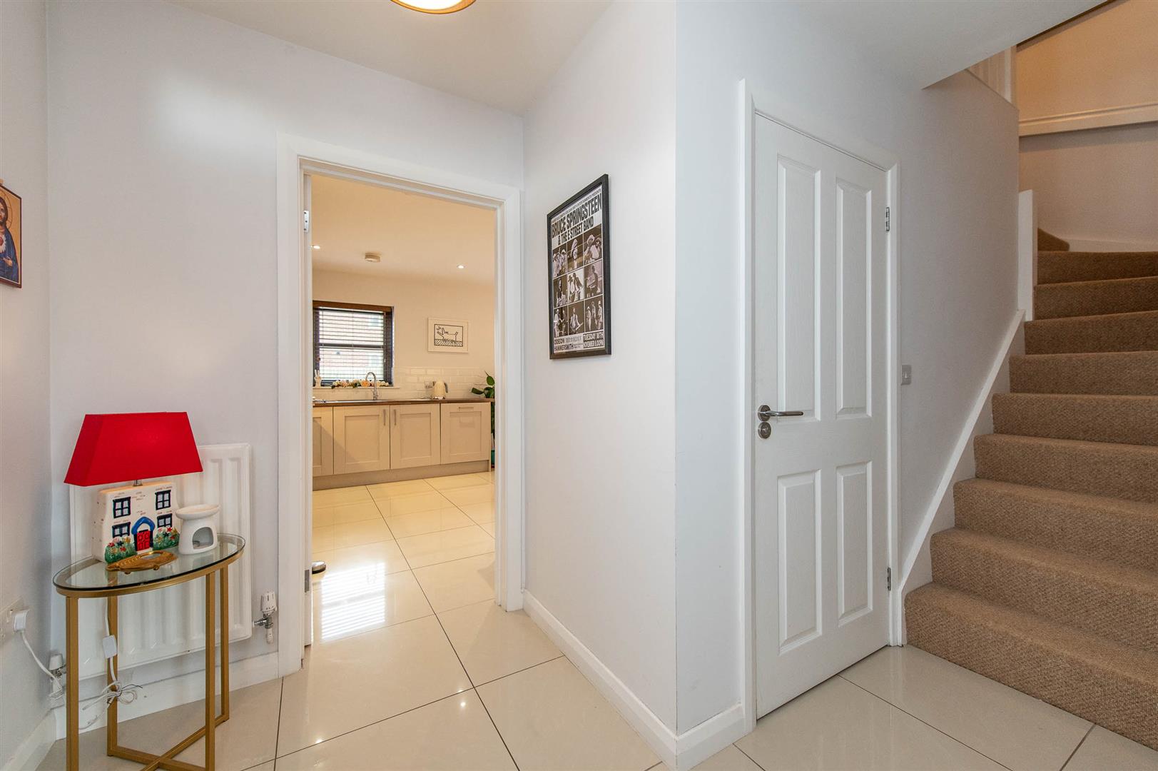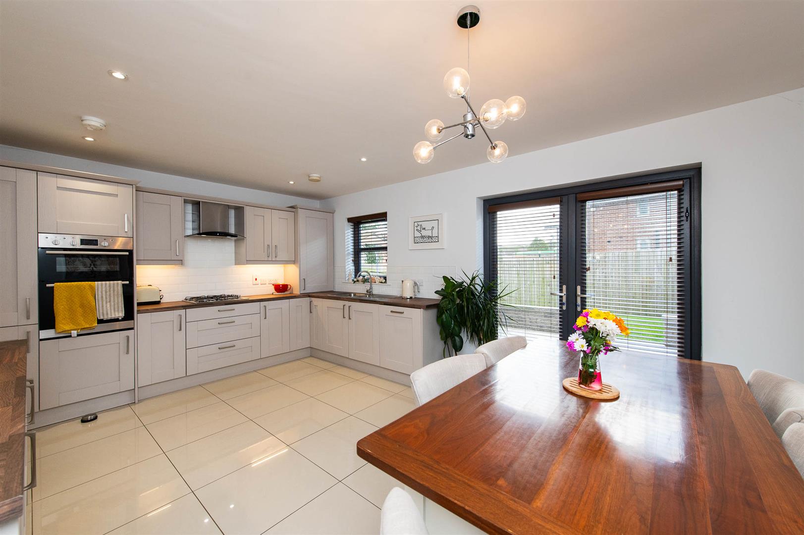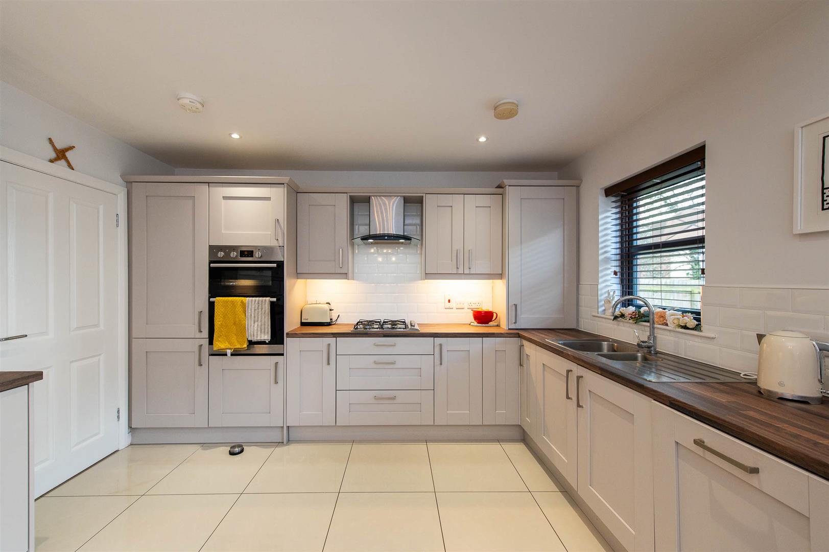 Modern shaker style kitchen with a range of high and low level units, round edge work surfaces, built in fridge freezer, built in dishwasher, built in double oven, gas hob, stainless steel extractor hood, single drainer stainless steel sink unit, vegetable sink, wall tiling, ceramic tiled flooring, gas boiler, French doors to rear, under stair storage with ceramic tiled flooring, plumbed for washing machine, space for tumble dryer