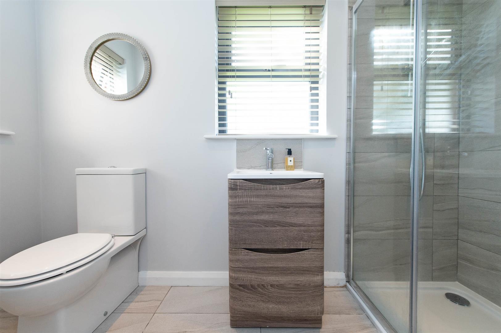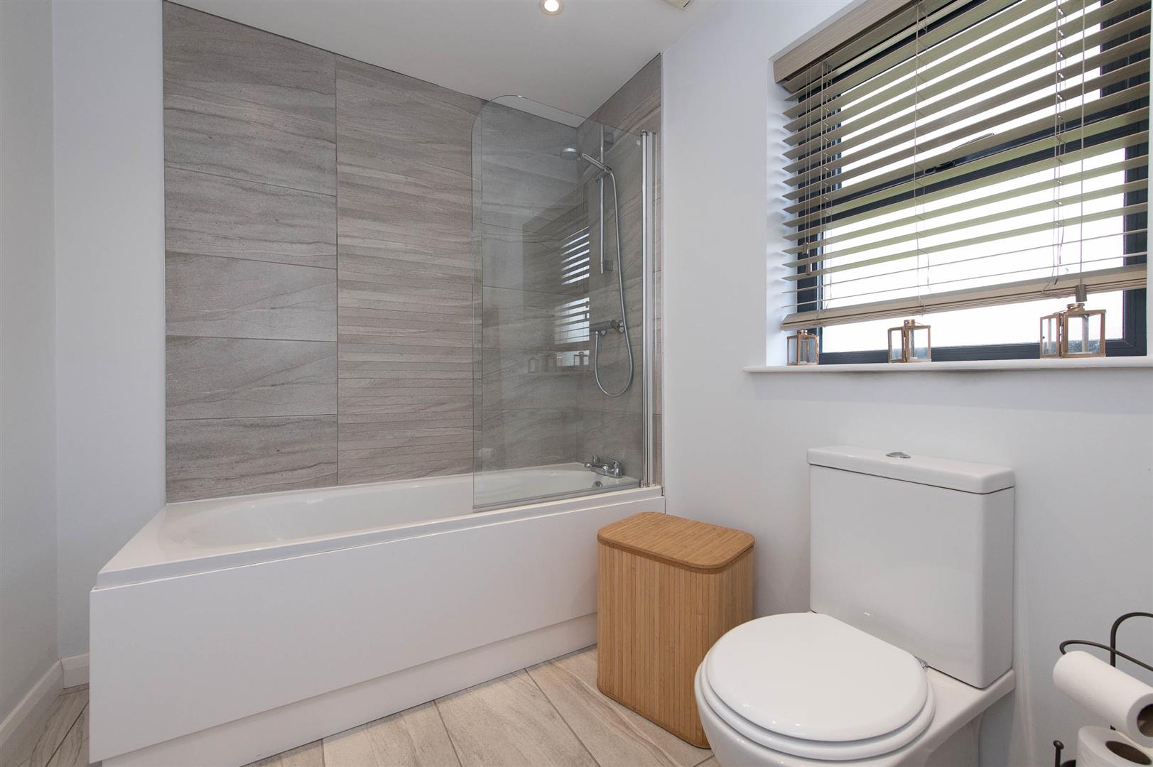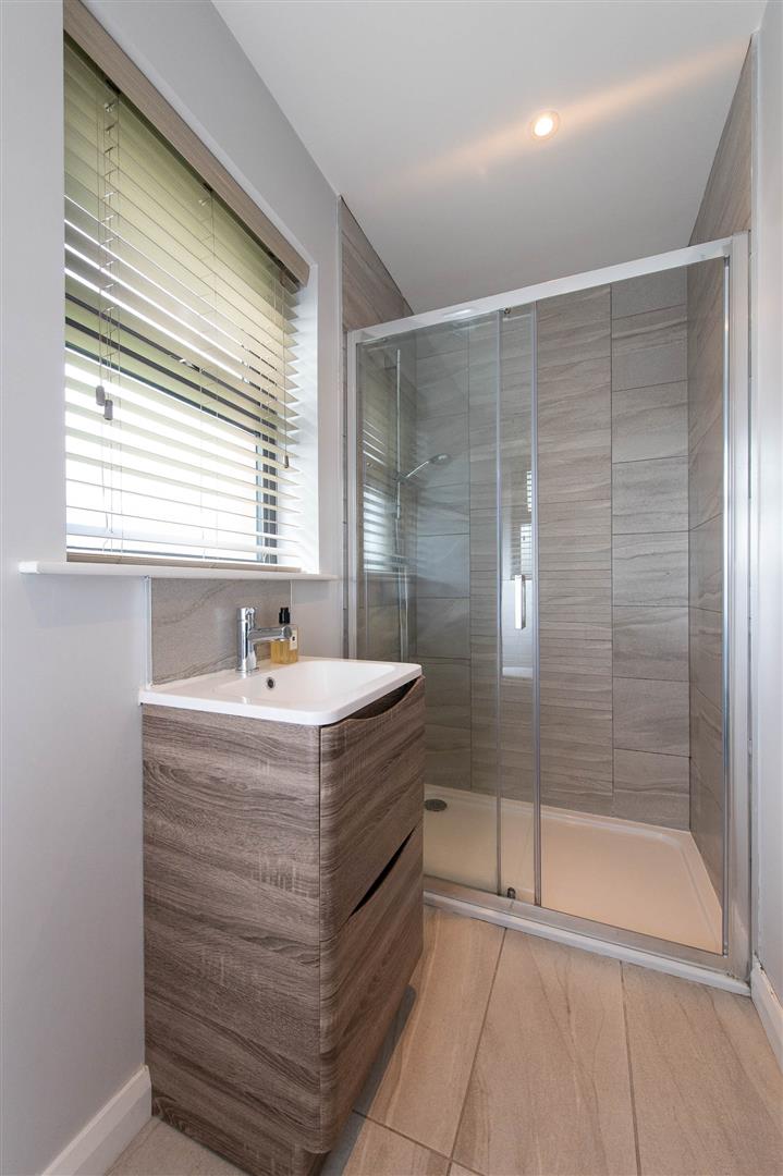 uPVC panelled bath unit, thermostatically controlled shower, glazed shower screen, floating vanity sink unit with mixer taps, low flush W/C, downlighters, extractor fan, ceramic tiled flooring, chrome heated towel rail