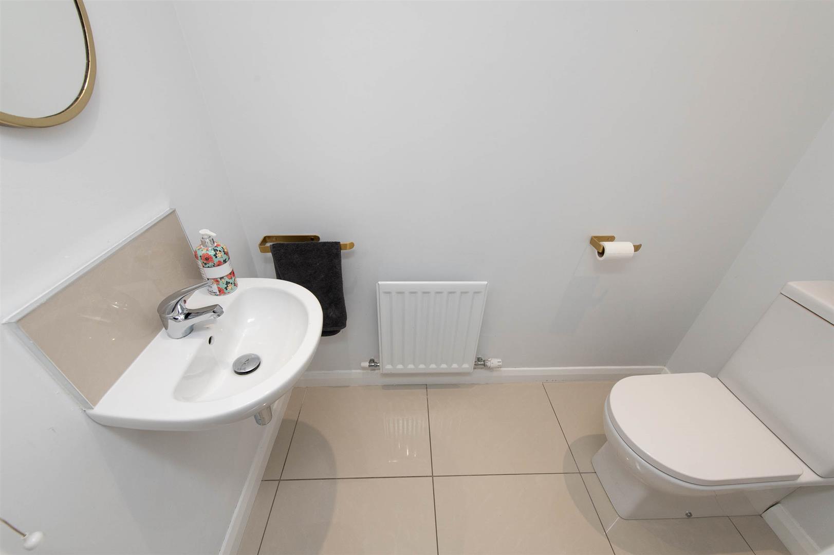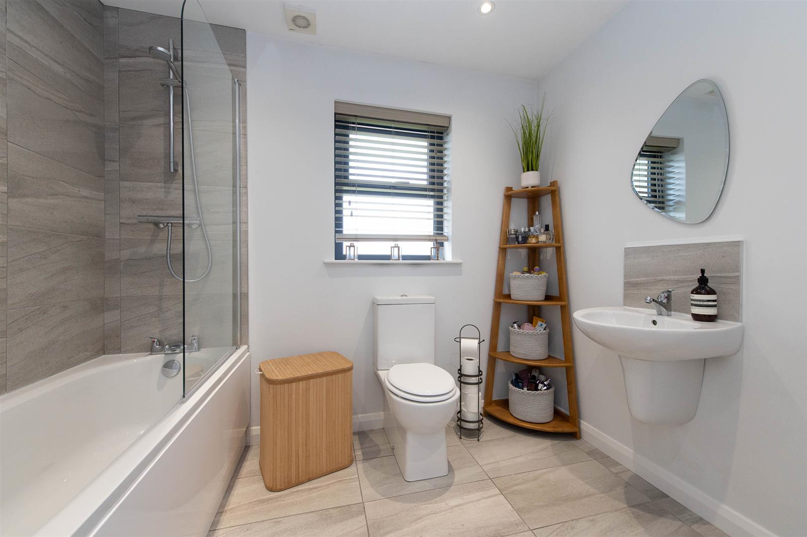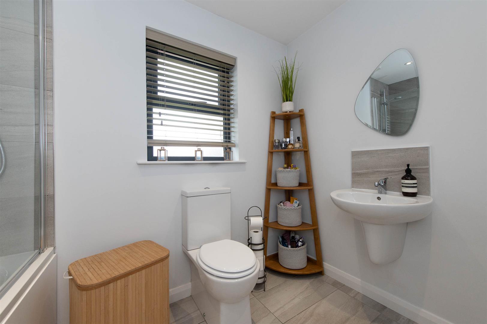 uPVC panelled bath unit, thermostatically controlled shower, glazed shower screen, floating vanity sink unit with mixer taps, low flush W/C, downlighters, extractor fan, ceramic tiled flooring, chrome heated towel rail