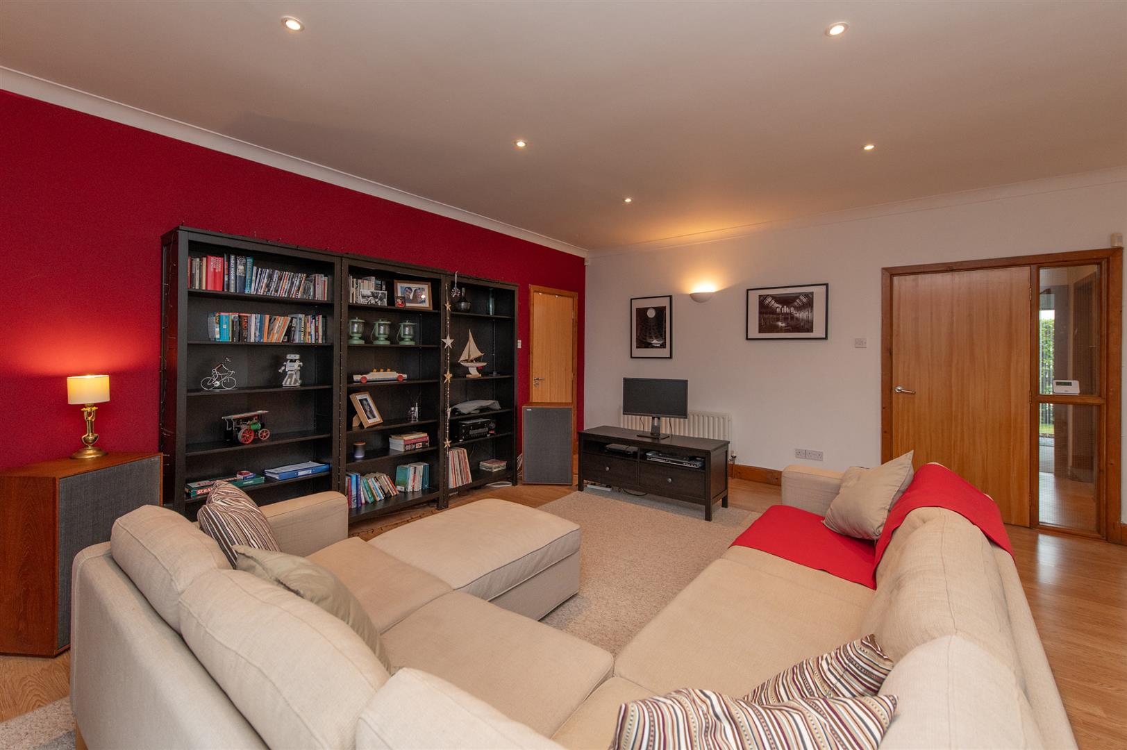Open plan, laminate wood flooring, downlighters, large space understairs, can be used as office with phone point & power point