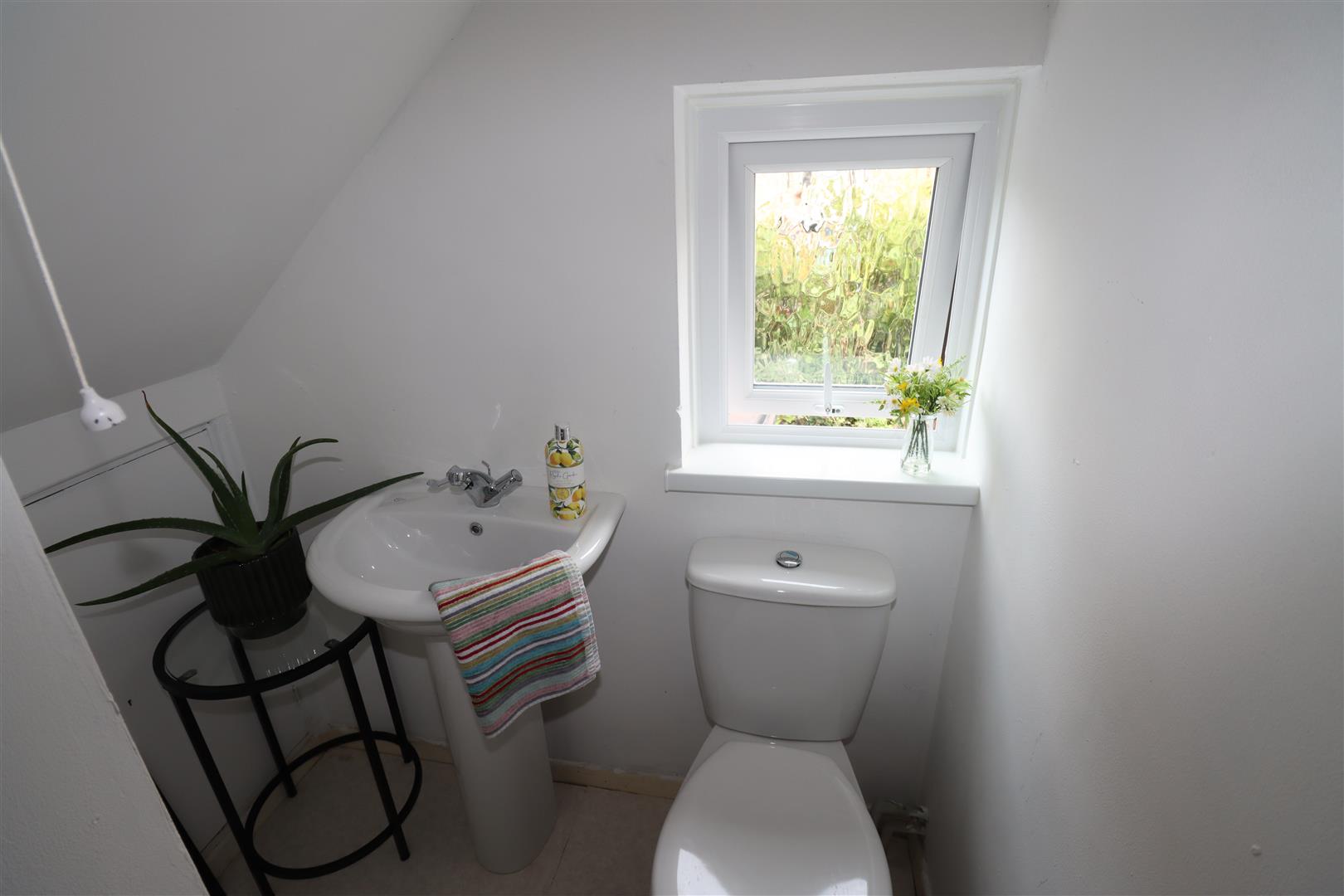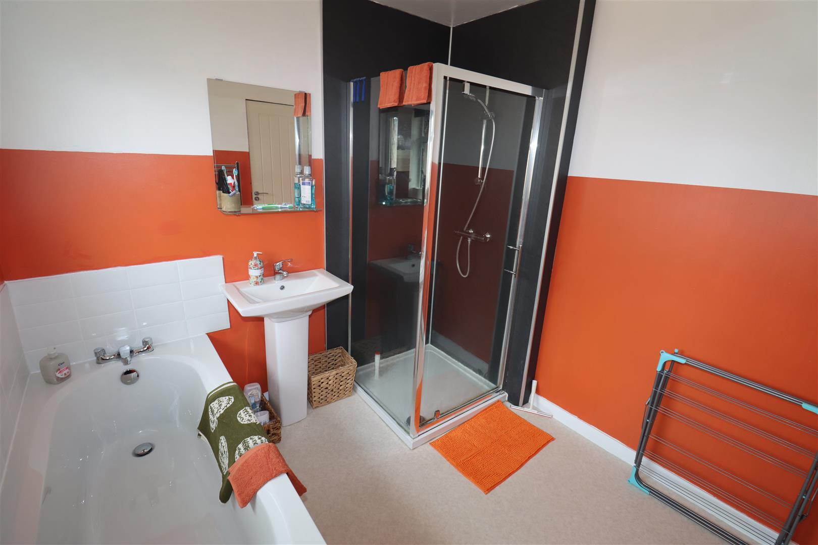uPVC bath unit with mixer taps, shower unit with thermostatically controlled shower, glazed shower screen, low flush W/C, chrome heated towel rail, pedestal wash hand basin, downlighters, wall tiling, access to floored roofspace with gas boiler