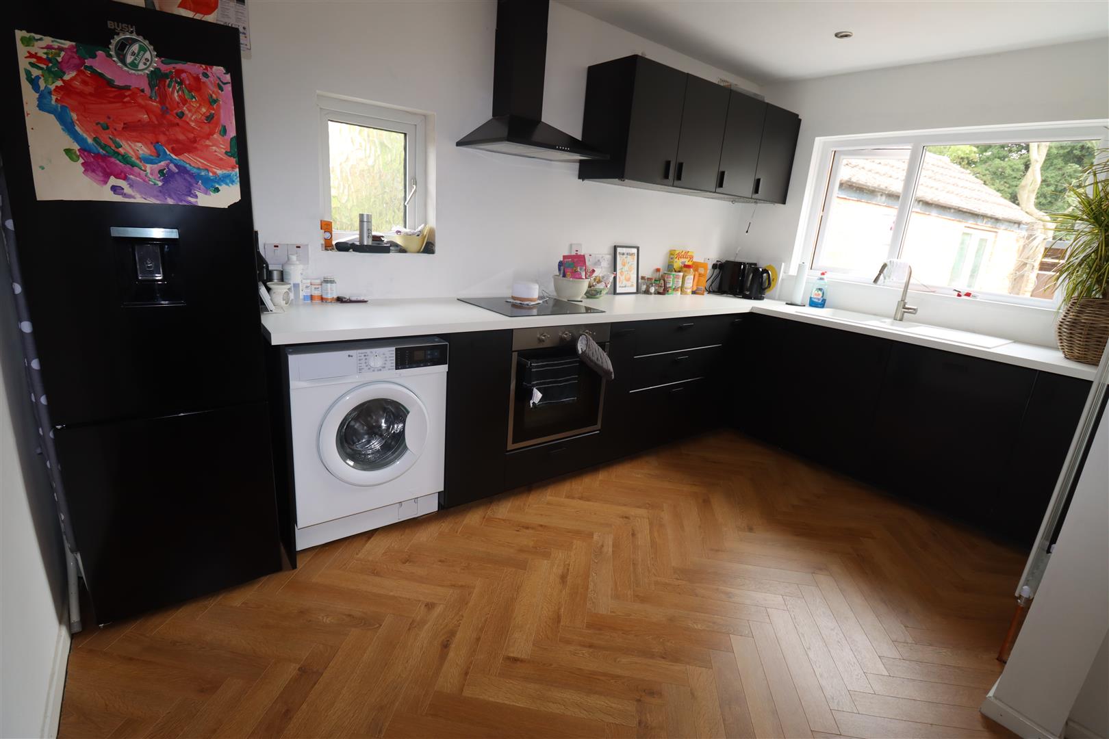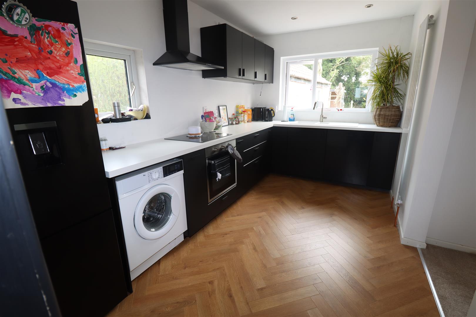 Modern fitted kitchen with range of high and low level units, straight edge worksurfaces, single drainer composite sink unit with vegetable sink and mixer taps, built in dishwasher, plumbed for washing machine, space for fridge freezer, built in stainless steel oven, extractor hood, inlaid hob, downlighters, vertical radiator