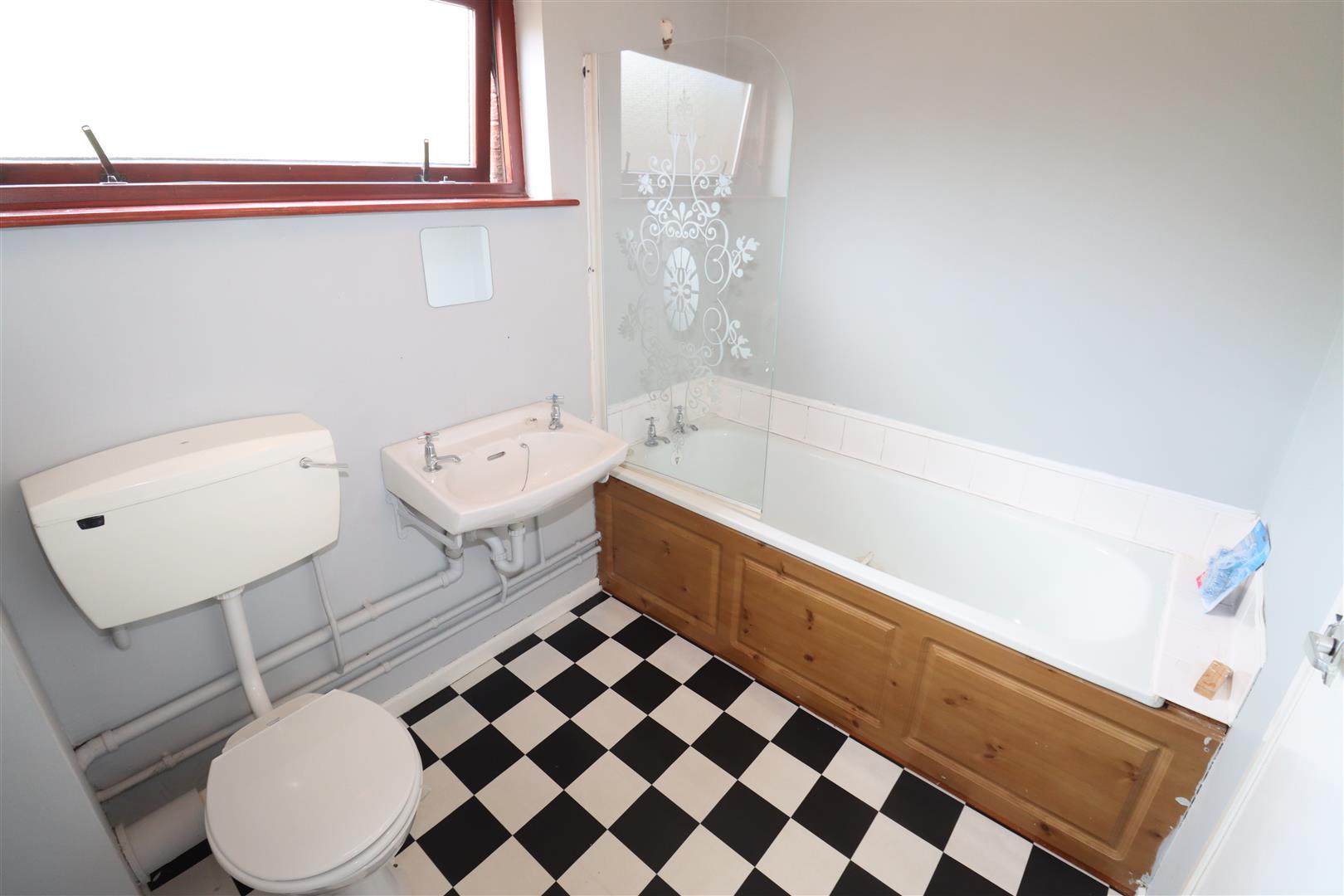 Panelled bath unit, glazed shower screen, mixer taps, low flush W/C, hanging sink unit