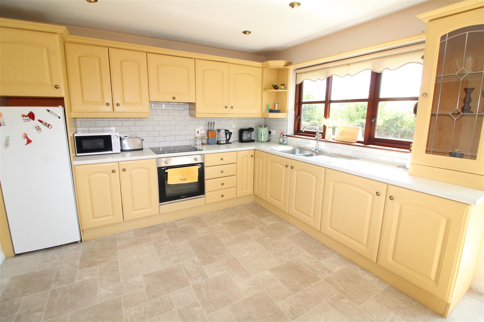 Fitted kitchen with casual dining area, patio doors to rear