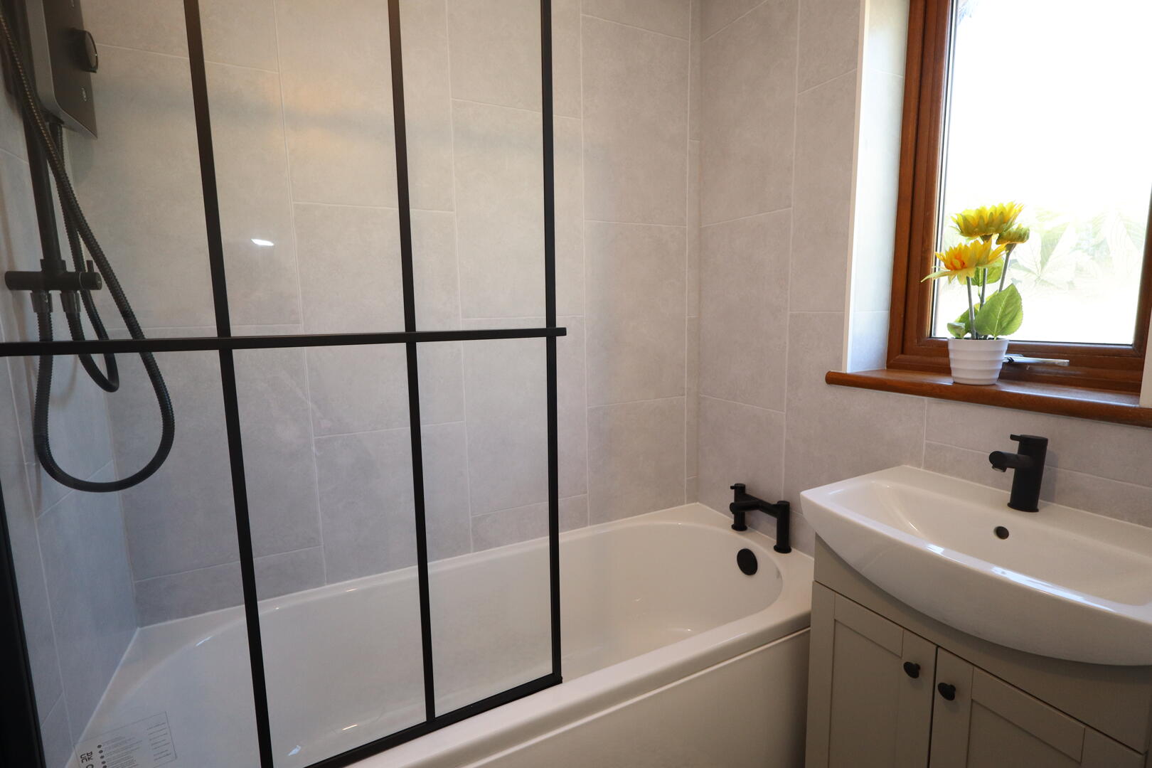 White suite comprising panelled bath, glazed shower screen, Triton electric shower, low flush W/C, vanity unit sink, wall panelling, ceramic tiled flooring, heated towel rail, hot press with insulated copper cylinder