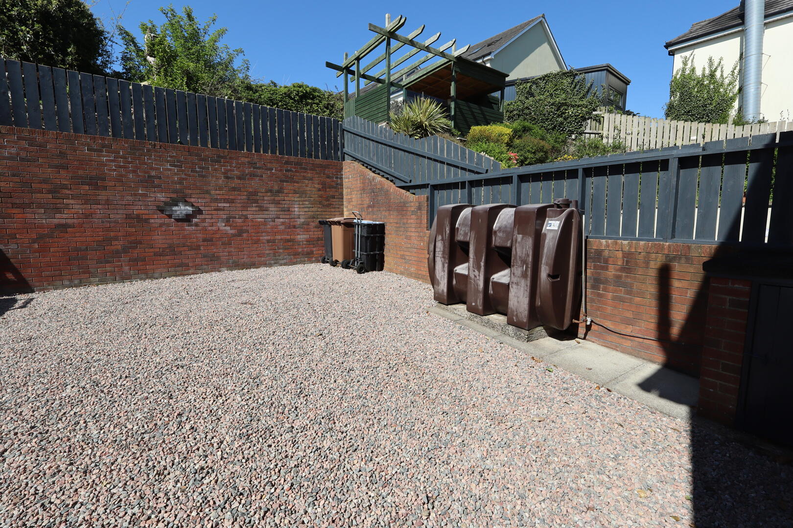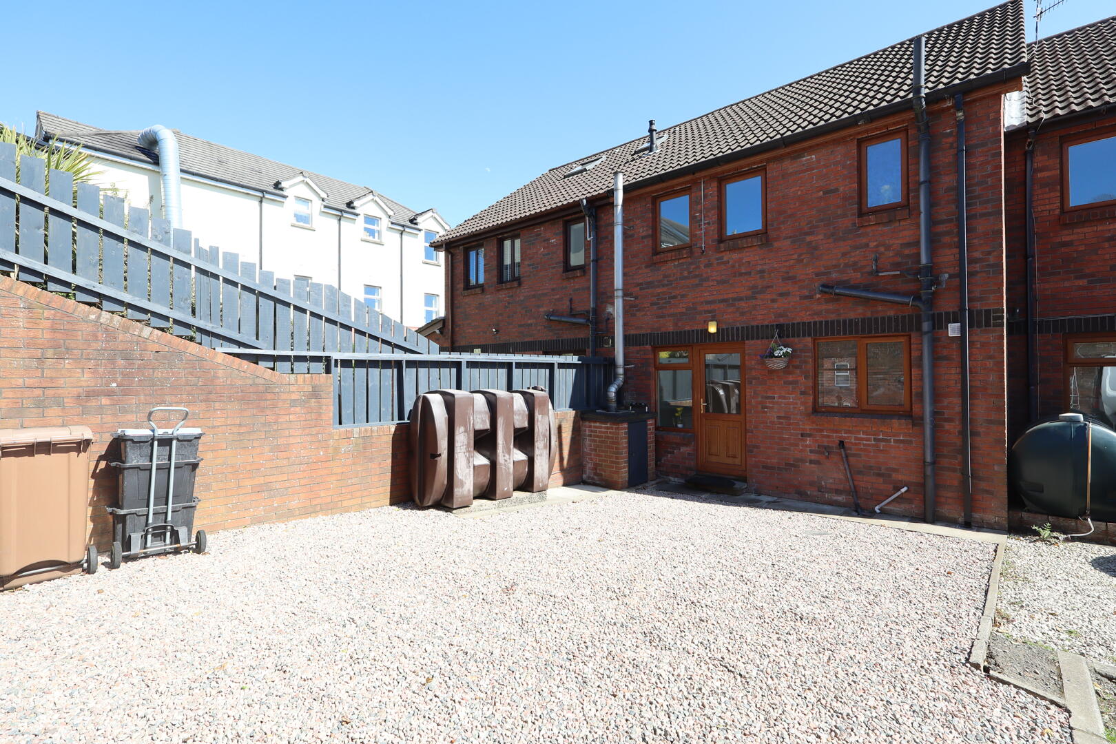 Rear: off street parking to rear, in stones, PVC oil storage tank, boiler house with oil fired boiler, outside light and tap