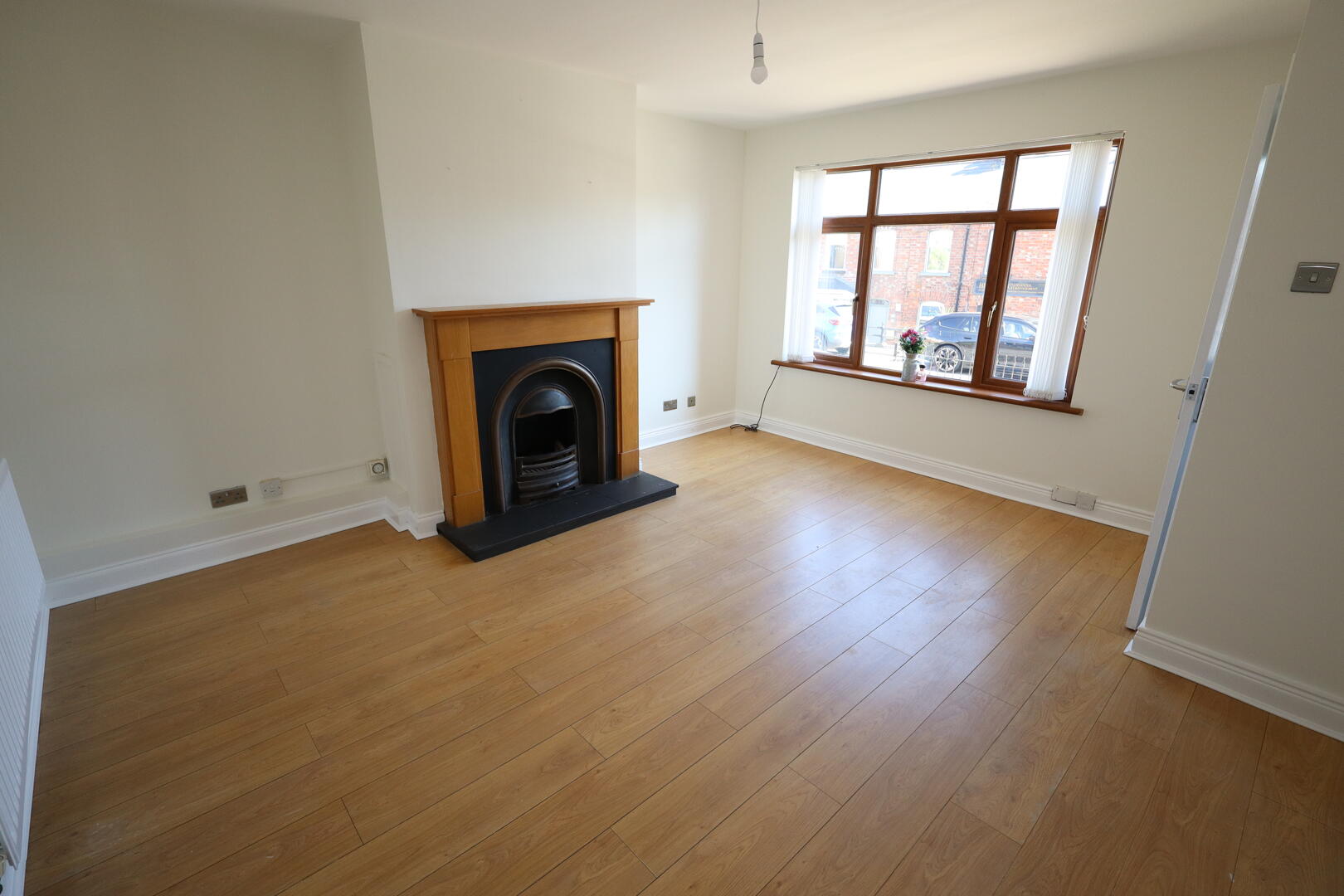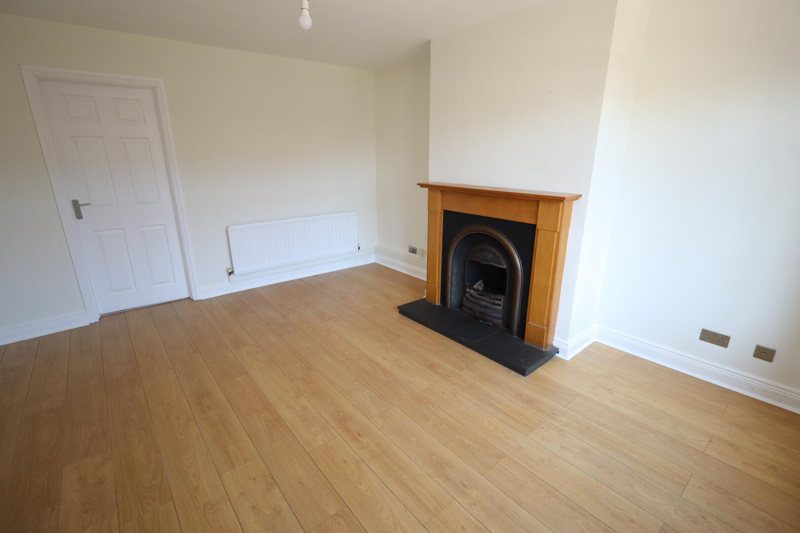 Laminate wood flooring, feature fireplace and slate hearth, open fire