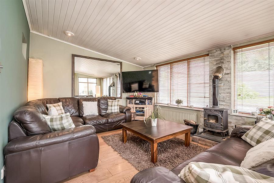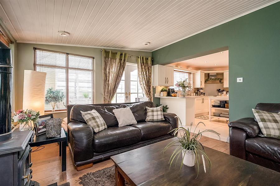Cast iron wood burning stove on slate hearth. Wood laminate floor covering. Open arch to kitchen. Glass panelled French doors leading to: