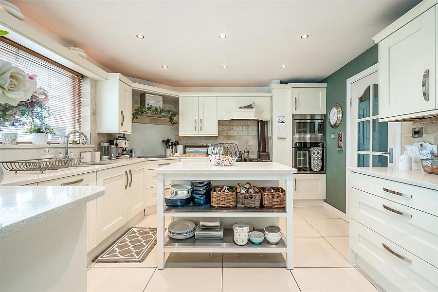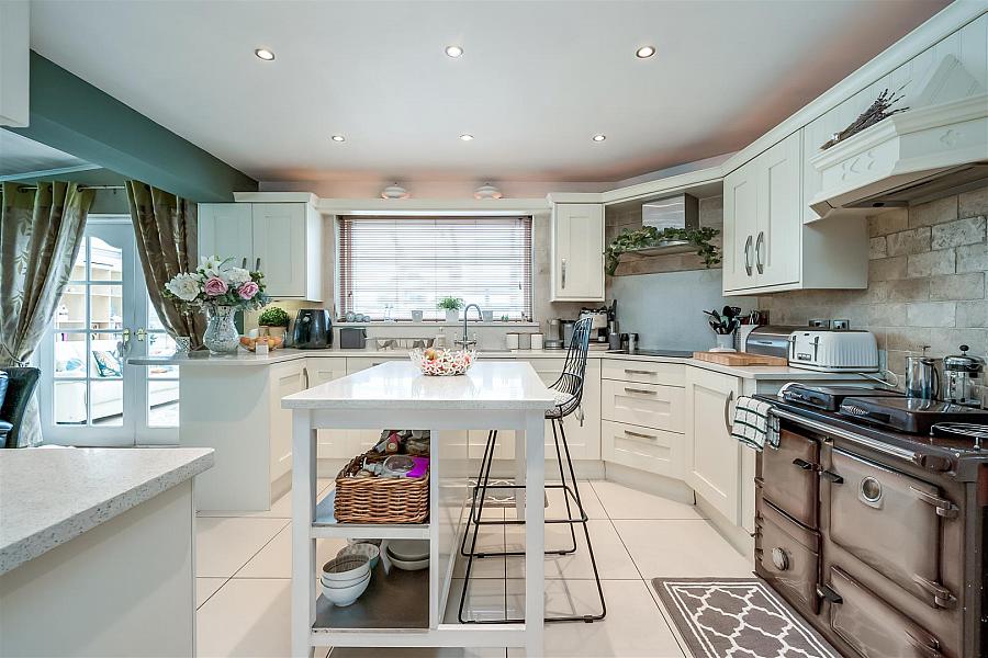 Modern fitted kitchen with range of high and low level storage units with contrasting solid quartz work surface. Matching island unit with breakfast bar area. Inlaid 1.5 bowl sink unit. Coal fired Rayburn oven with extractor hood over. Integrated touch screen ceramic hob with solid quartz splash back and extractor hood over. Integrated oven, microwave oven and dishwasher. Splash back tiling to walls. Tiled floor.