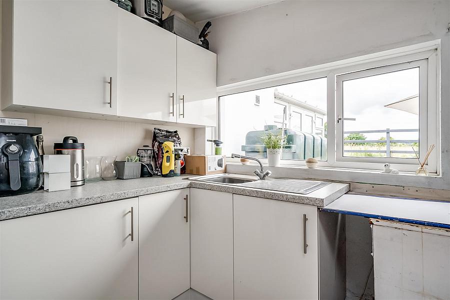 Range of fitted storage units with contrasting granite effect melamine work surface. Stainless steel sink unit with draining bay. Plumbed for automatic washing machine. Space for fridge freezer. Oil fired central heating boiler. Tiled floor. Hardwood glass panelled door to rear garden.