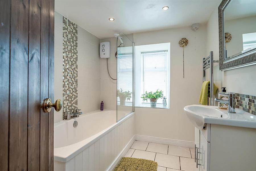 White three piece suite comprising panelled bath, vanity unit and WC. Electric shower and glass shower screen over bath. Chrome towel radiator. Part tiling to walls. Tiled floor.