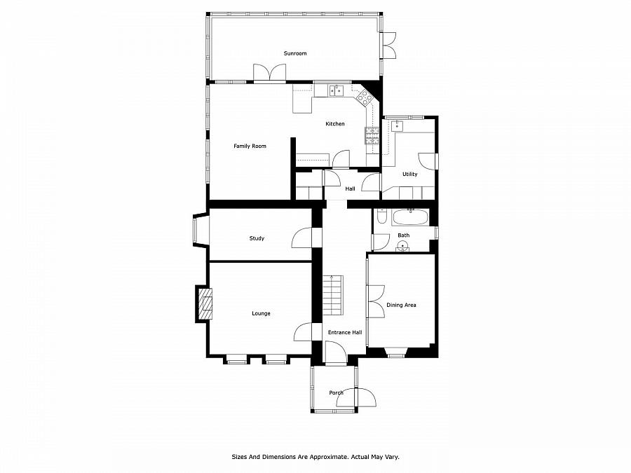 Tiled floor. Stairwell to first floor.