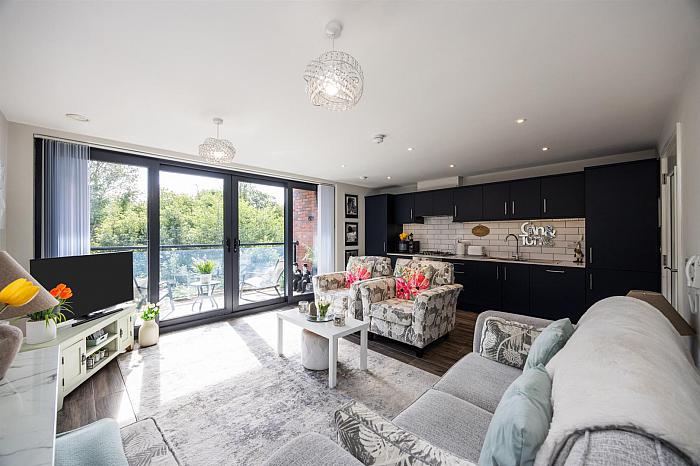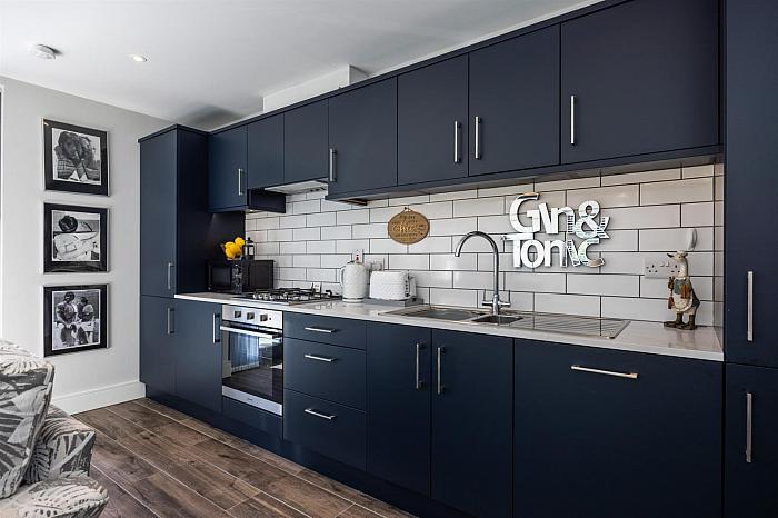 Modern fitted kitchen with range of high and low level storage units with contrasting, stone effect, melamine work surface. Stainless steel 1.5 bowl sink unit with draining bay. Integrated gas hob with extractor hood over. Integrated oven, fridge freezer and dishwasher. Gas fired central heating boiler (housed within matching unit). Splashback tiling to walls. Tiled floor. PVC double glazed, sliding patio doors leading to private balcony area.