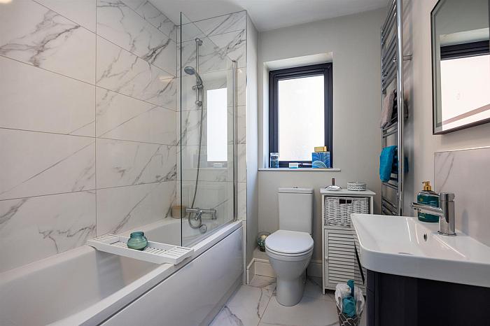 Contemporary, white, three piece suite comprising panelled bath, floating vanity unit and WC. Glass shower screen over bath. Chrome towel radiator. Splashback tiling to sink. Tiled floor.