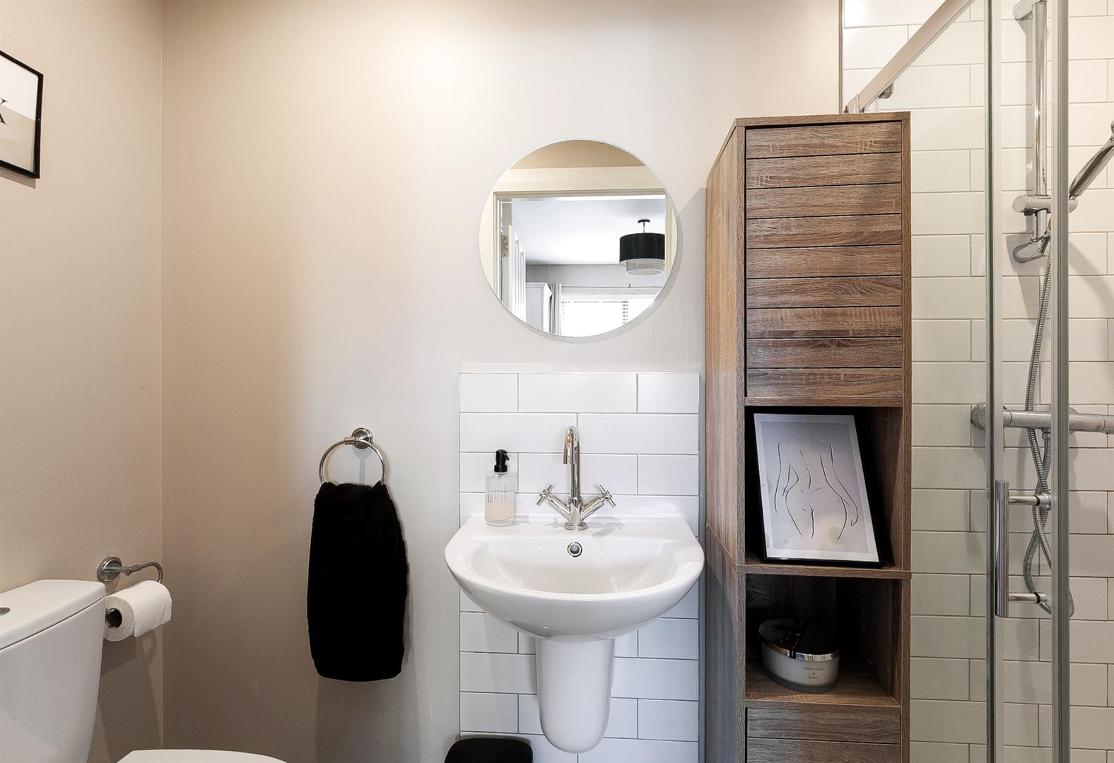 Contemporary, white, three piece suite comprising fully tiled shower enclosure, semi pedestal wash hand basin and WC. Thermostat controlled mains shower unit. Splashback tiling to sink. Chrome towel radiator. Tiled floor.