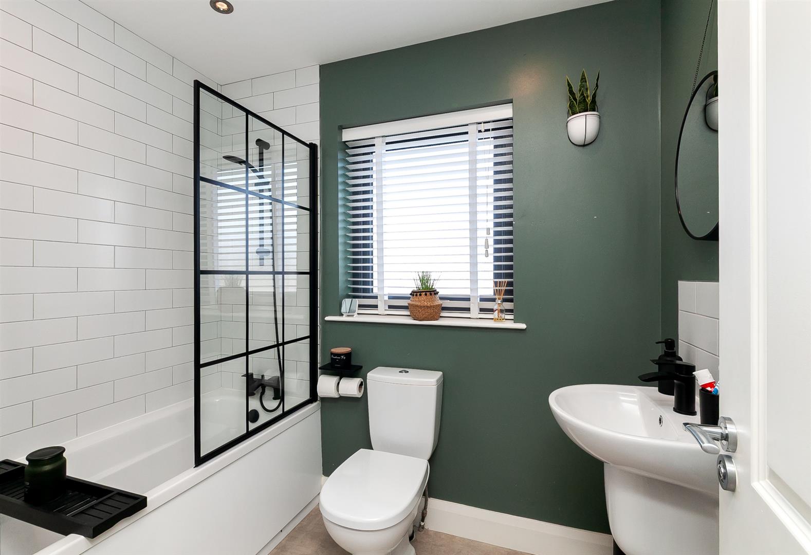 Contemporary, white, three piece suite comprising panelled bath, semi pedestal was hand basin and WC. Glass shower screen over bath. Part tiling to walls. Chrome towel radiator. Tiled floor.