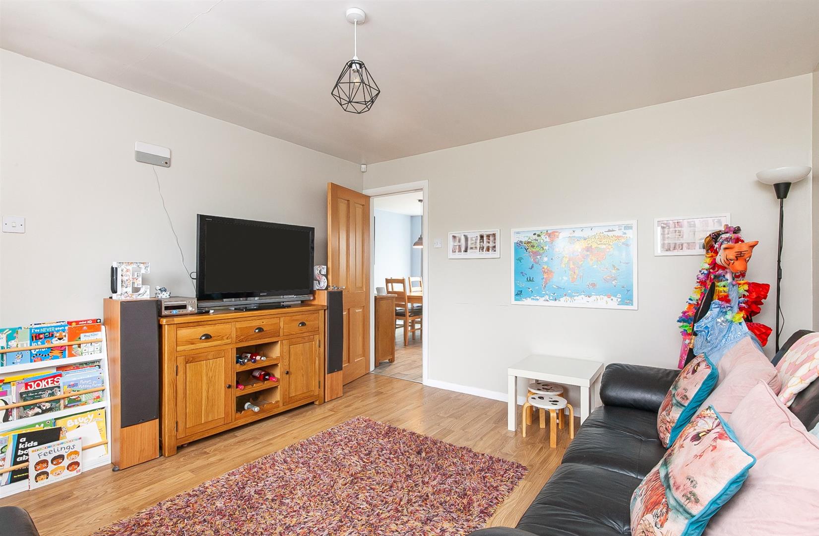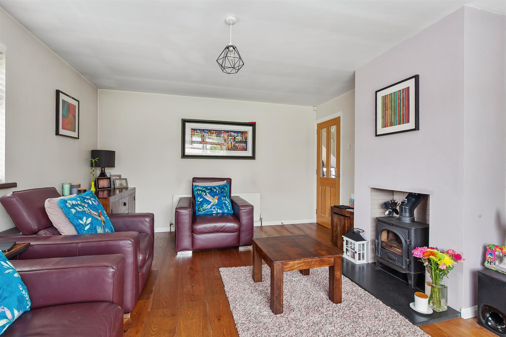 Dual aspect windows. Tiled inglenook recess with cast iron wood burning stove on slate hearth. Wood laminate floor covering.