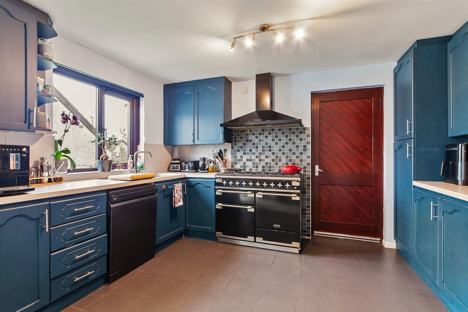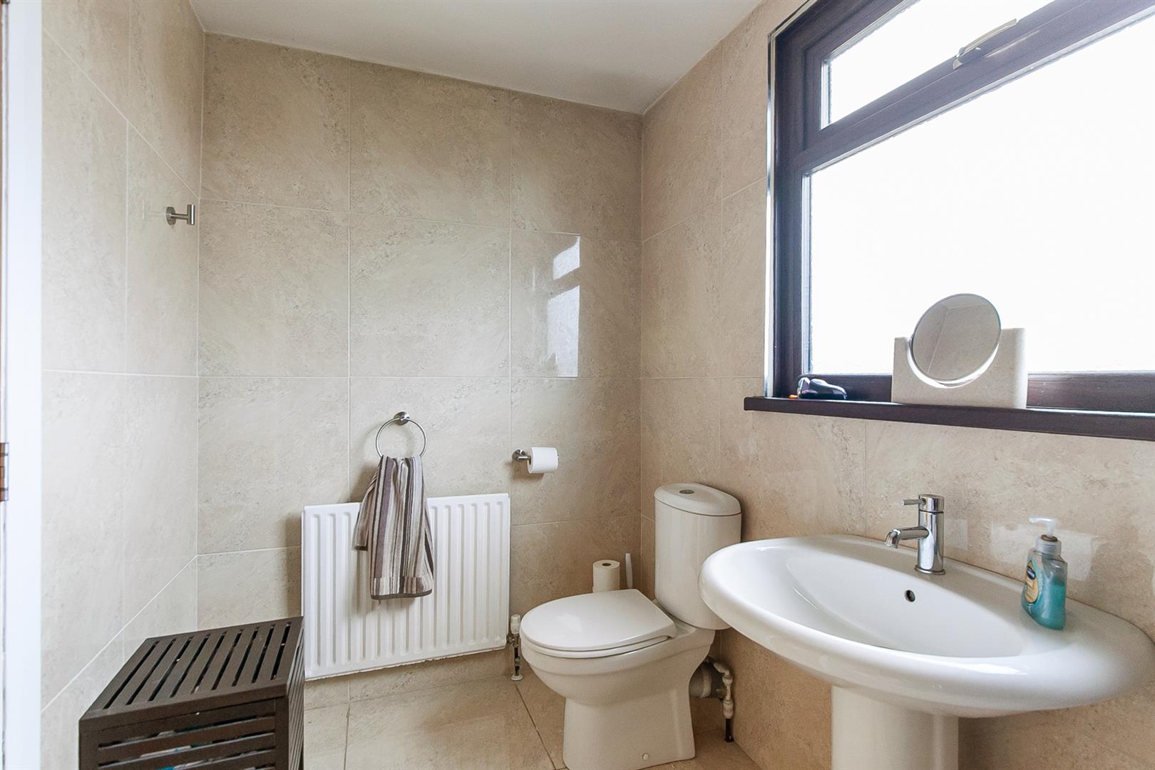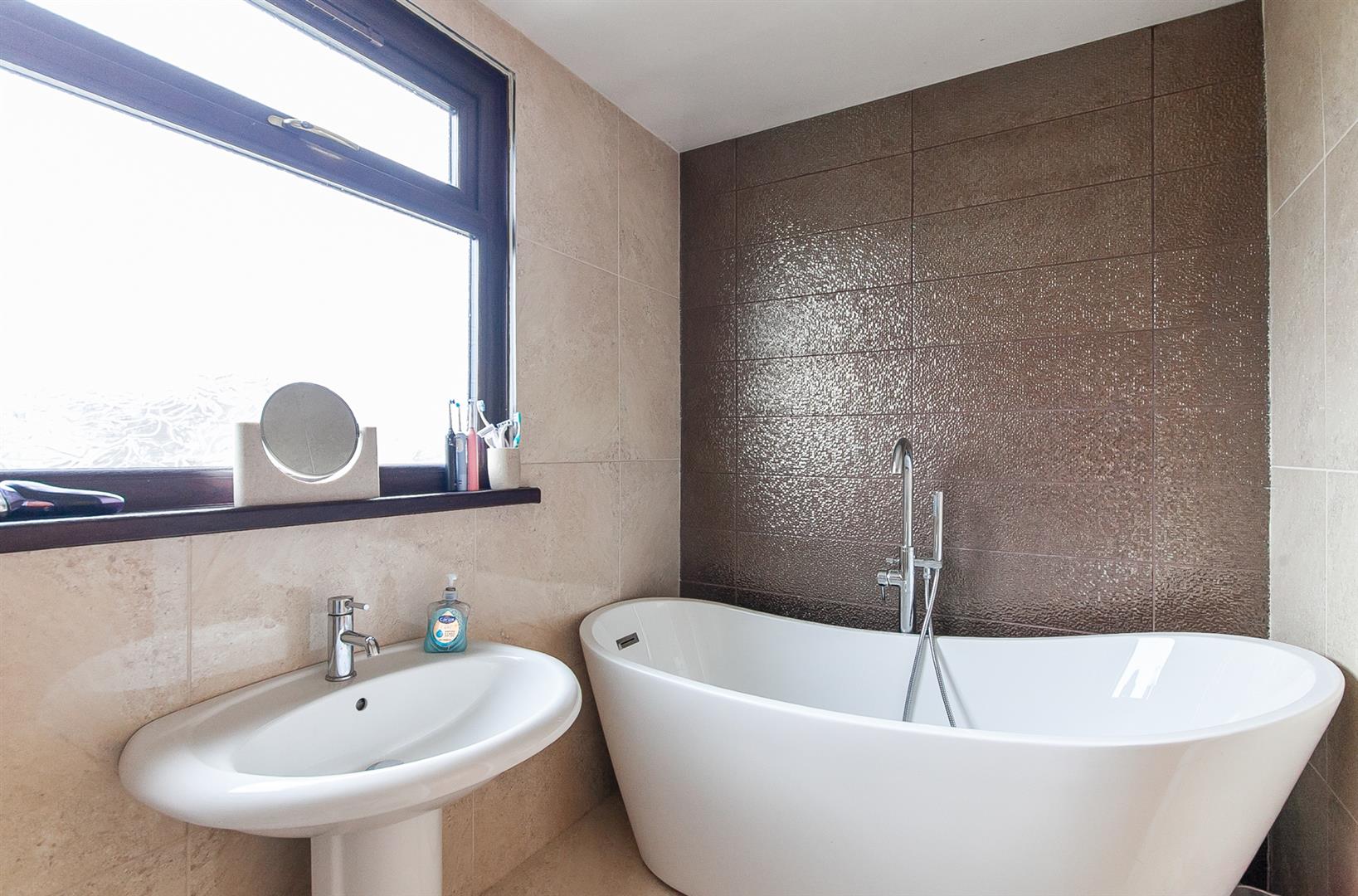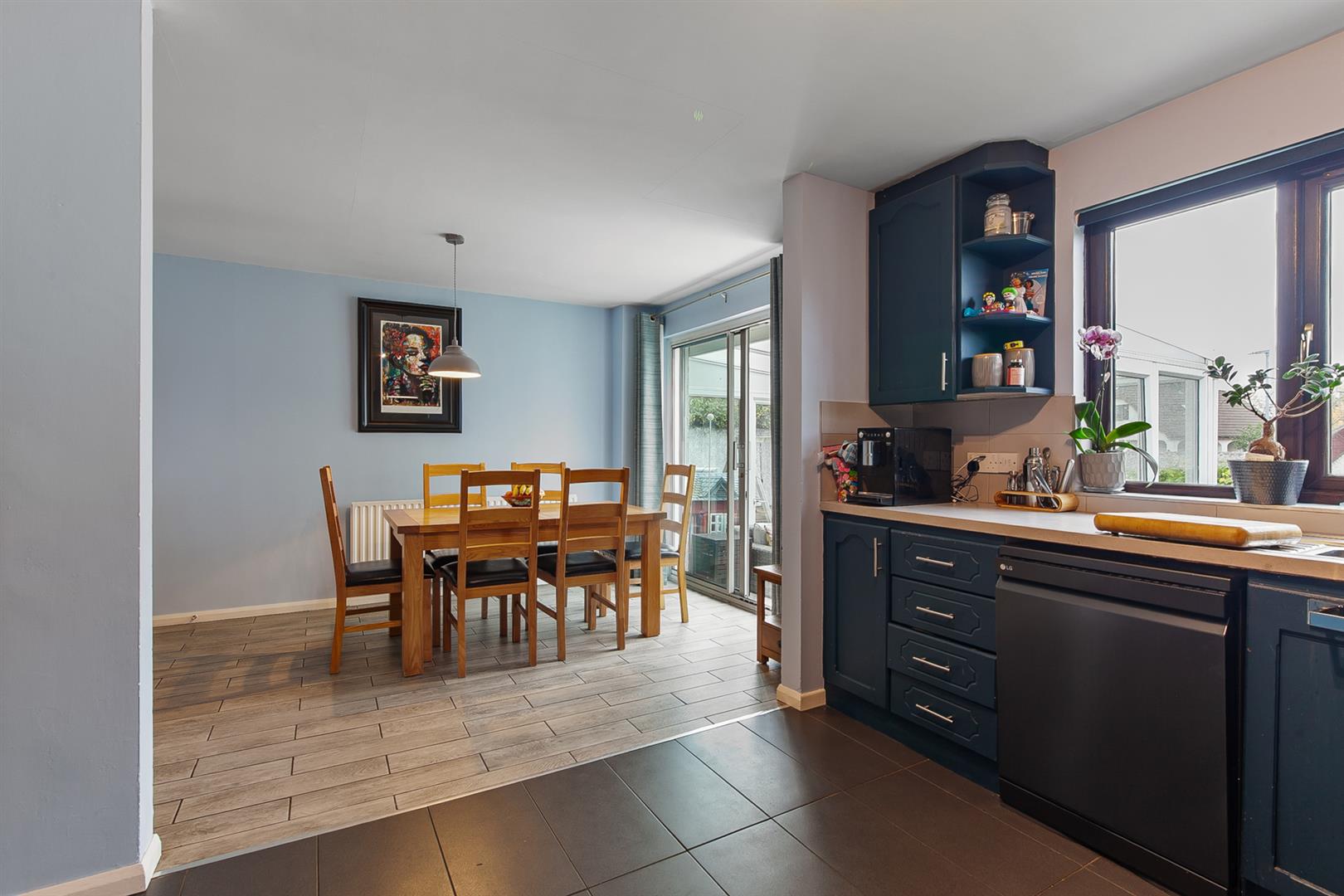 Ceramic, double sink unit. Plumbed and space for washing machine. Space for tumble dryer. Low level storage unit. Wood block effect, melamine work surface. Splashback tiling to sink. Gas fired central heating boiler. Access to integral garage. PVC double glazed door leading to rear garden.