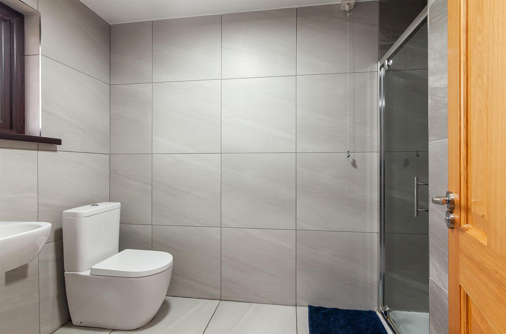 Contemporary, white, three piece suite comprising shower enclosure, pedestal wash hand basin and WC. Electric shower. Towel radiator.