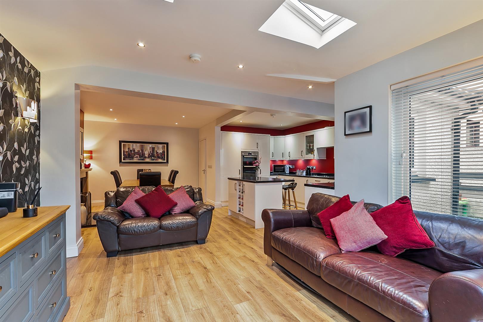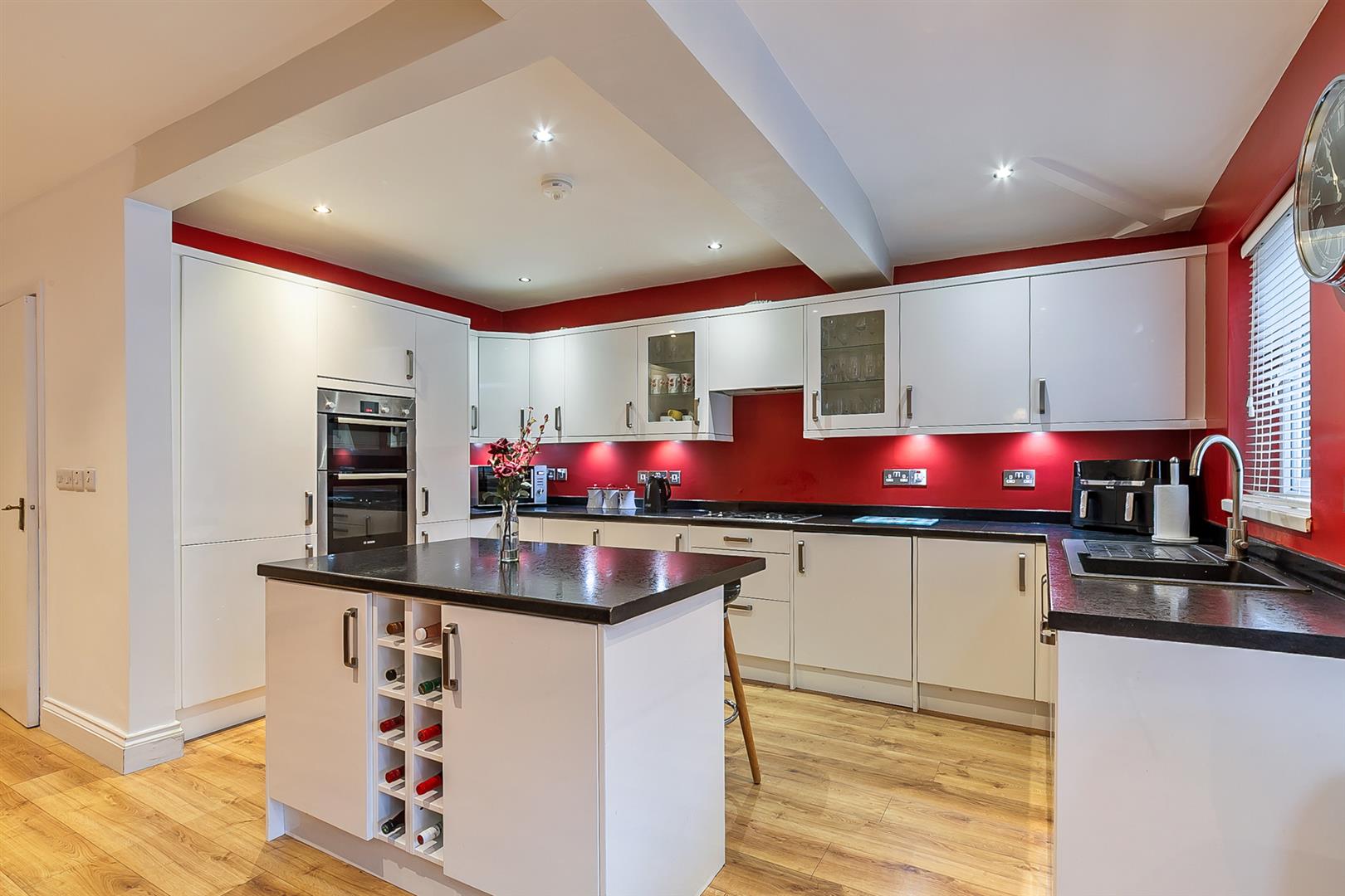KITCHEN WITH INFORMAL DINING AREA 14'6" X 9'1" (wps) (4.44m X 2.77m (wps)) Modern fitted white high gloss kitchen with comprehensive range of high and low level storage units with contrasting granite effect melamine work surface. Matching island unit with breakfast bar area. Colour coded sink unit with draining bay. Integrated gas hob with extractor hood over. Integrated fridge freezer, dishwasher, double oven, washing machine and tumble dryer. Twin glass fronted display cabinets. Upstands to walls to match worktop. Wood laminate floor covering.