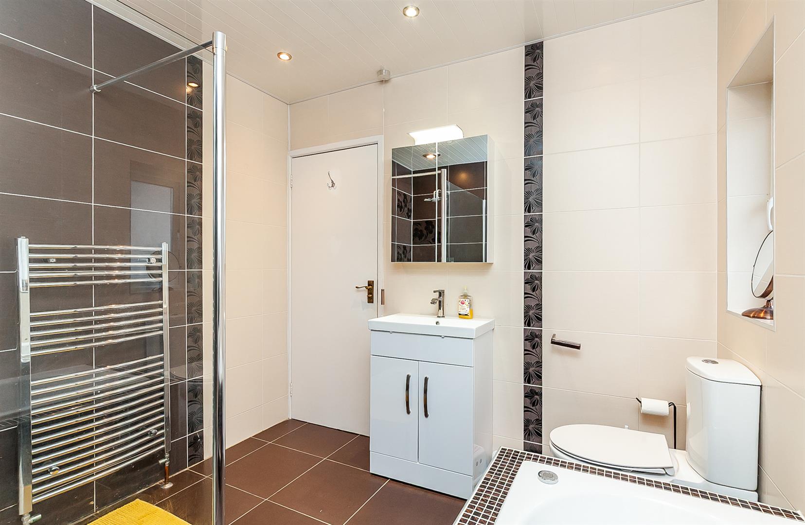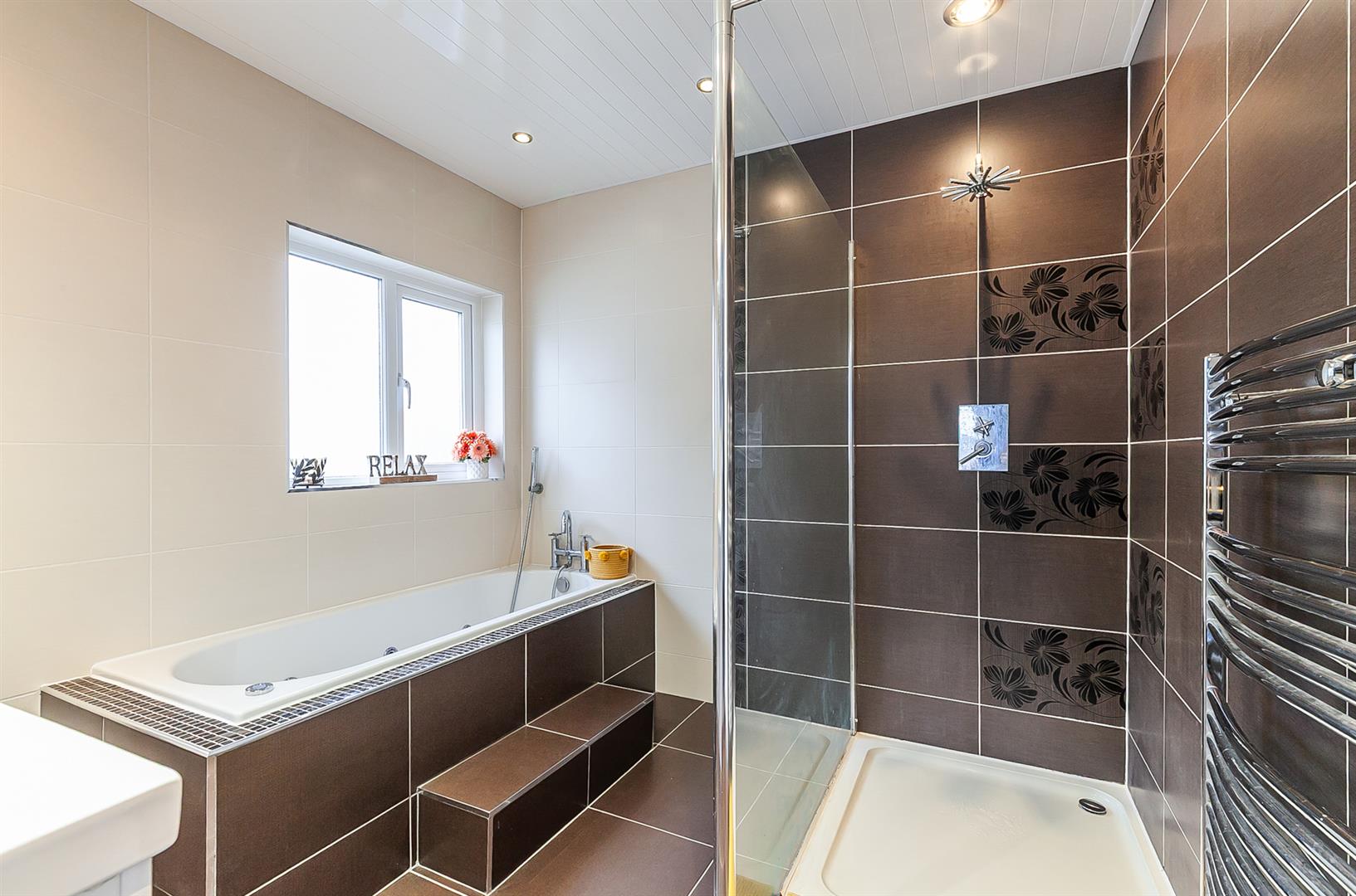 DELUXE FULLY TILED BATHROOM Contemporary, white, four piece suite comprising tile encased, jacuzzi/whirlpool style bath, separate shower enclosure, vanity unit and WC. Thermostat controlled mains shower unit. Chrome towel radiator.