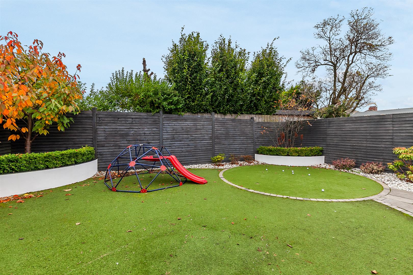 Fully enclosed rear garden finished in artificial grass, paved patio area, decorative stone, fixed seating, raised beds, and range of plants trees and shrubbery.