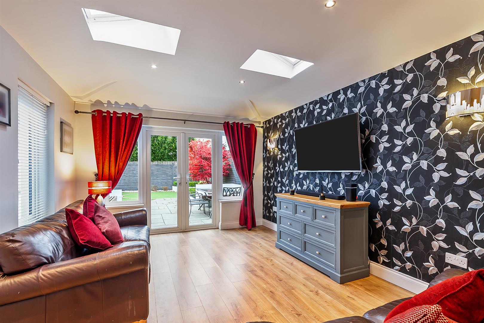 SUN LOUNGE 13'7" X 11'5" (4.16m X 3.49m) Wood laminate floor covering. Dual aspect windows. PVC double glazed French doors leading to rear garden.