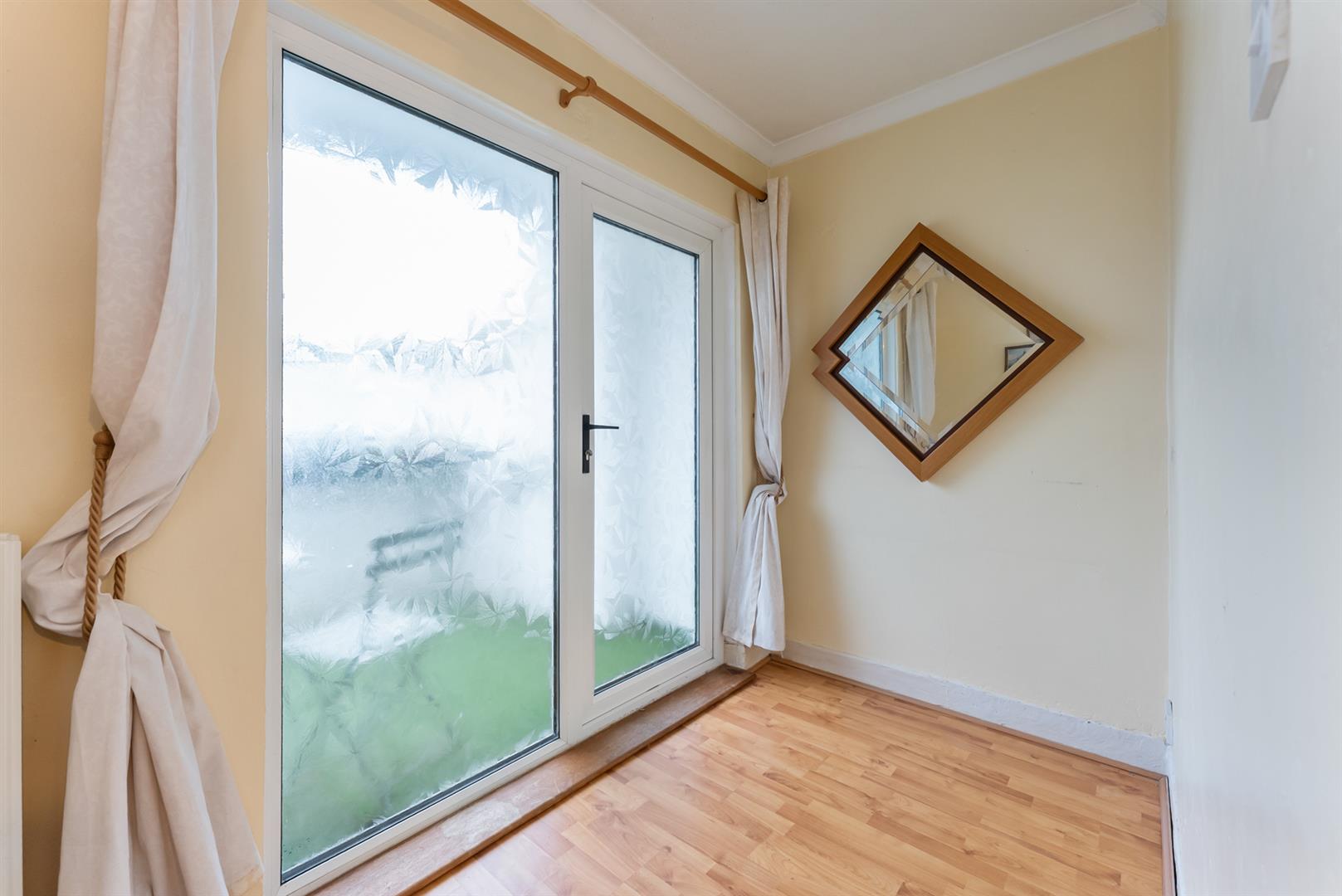 Focal point fireplace. Wood laminate floor covering. Access to cloakroom/store. PVC double glazed French door with matching side screen leading to private balcony.
