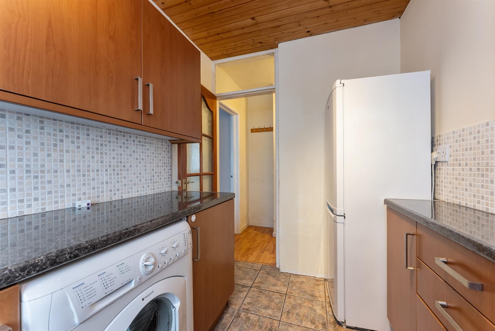 Modern fitted kitchen with range of high and low level storage units with contrasting granite effect melamine work surface. Stainless steel 1.5 bowl sink unit with draining bay. Integrated ceramic hob with extractor hood over. Integrated oven. Space for fridge freezer. Plumbed and space for washing machine. Gas fired central heating boiler (housed within matching unit). Splashback tiling to walls. Tiled floor.