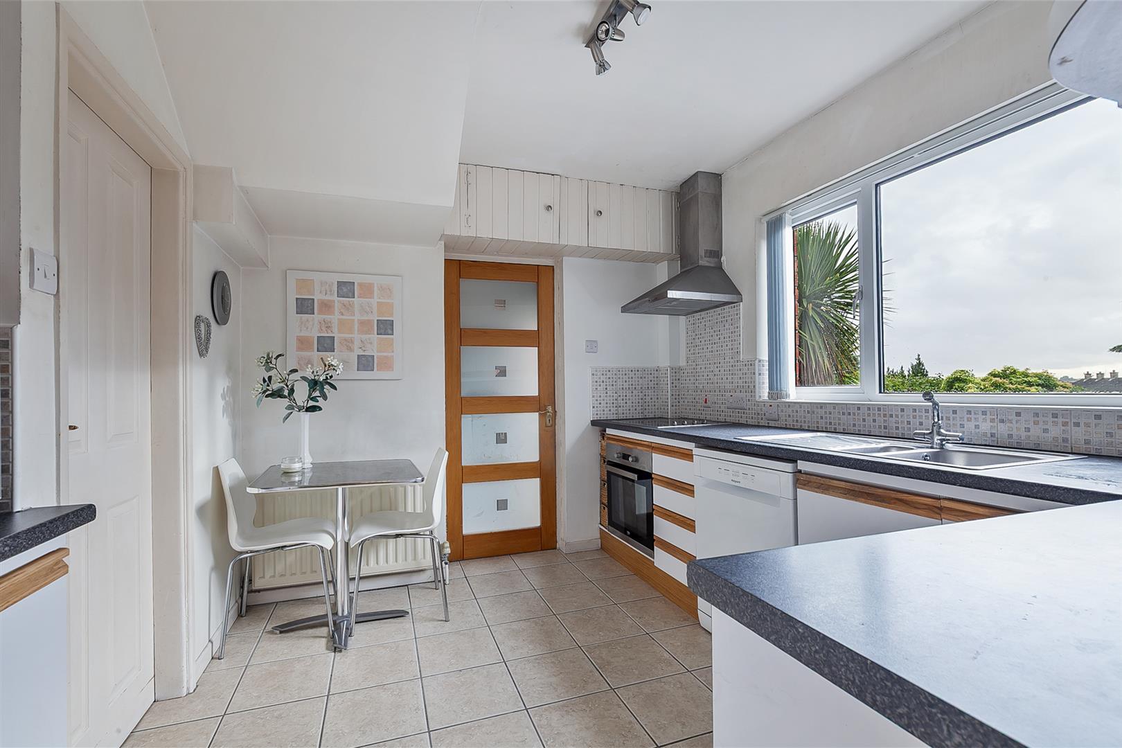 Fitted kitchen with range of high and low level storage units with contrasting granite effect melamine work surface. Stainless steel 1.5 bowl sink unit with draining bay. Integrated ceramic hob with stainless steel extractor hood over. Integrated oven. Space for undercounter fridge. Plumbed and space for dishwasher. Splashback tiling to walls. Tiled floor. Glass panelled door leading to: