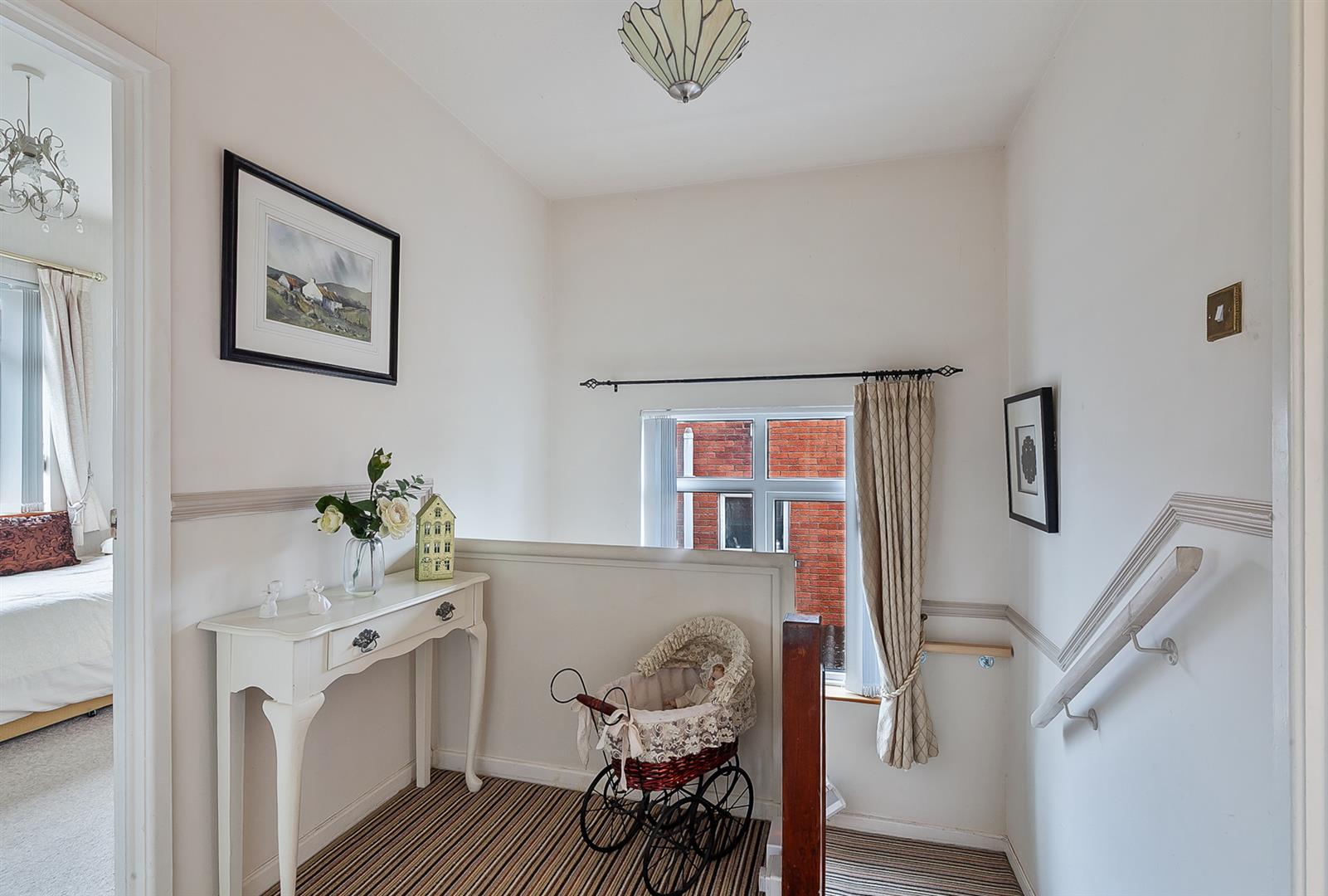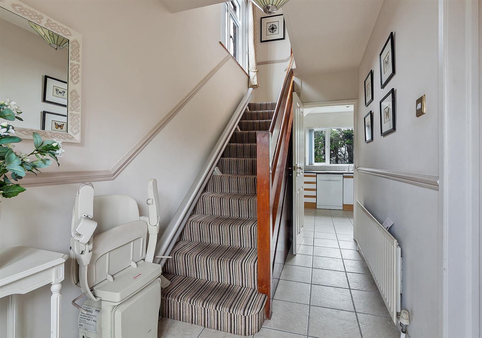 Part wood panelled glass door with matching side screen. Tiled floor. Stairwell to first floor. Access to under stairs store.