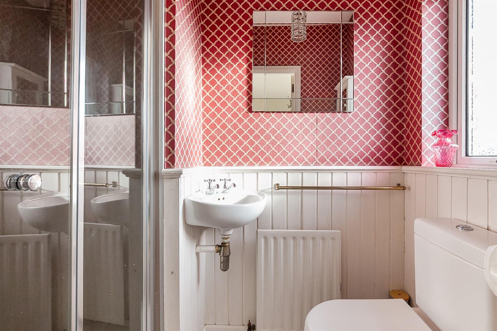 White three piece suite comprising shower enclosure, wash hand basin and WC. Thermostat control main shower unit. Half panelling to walls. Tiled floor.
