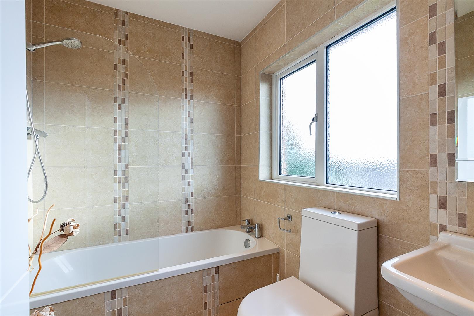 Contemporary, white three piece suite comprising tiled case bath, semi pedestal wash hand basin and WC. Thermostat control main shower unit and glass shower screen over bath. Chrome towel radiator.