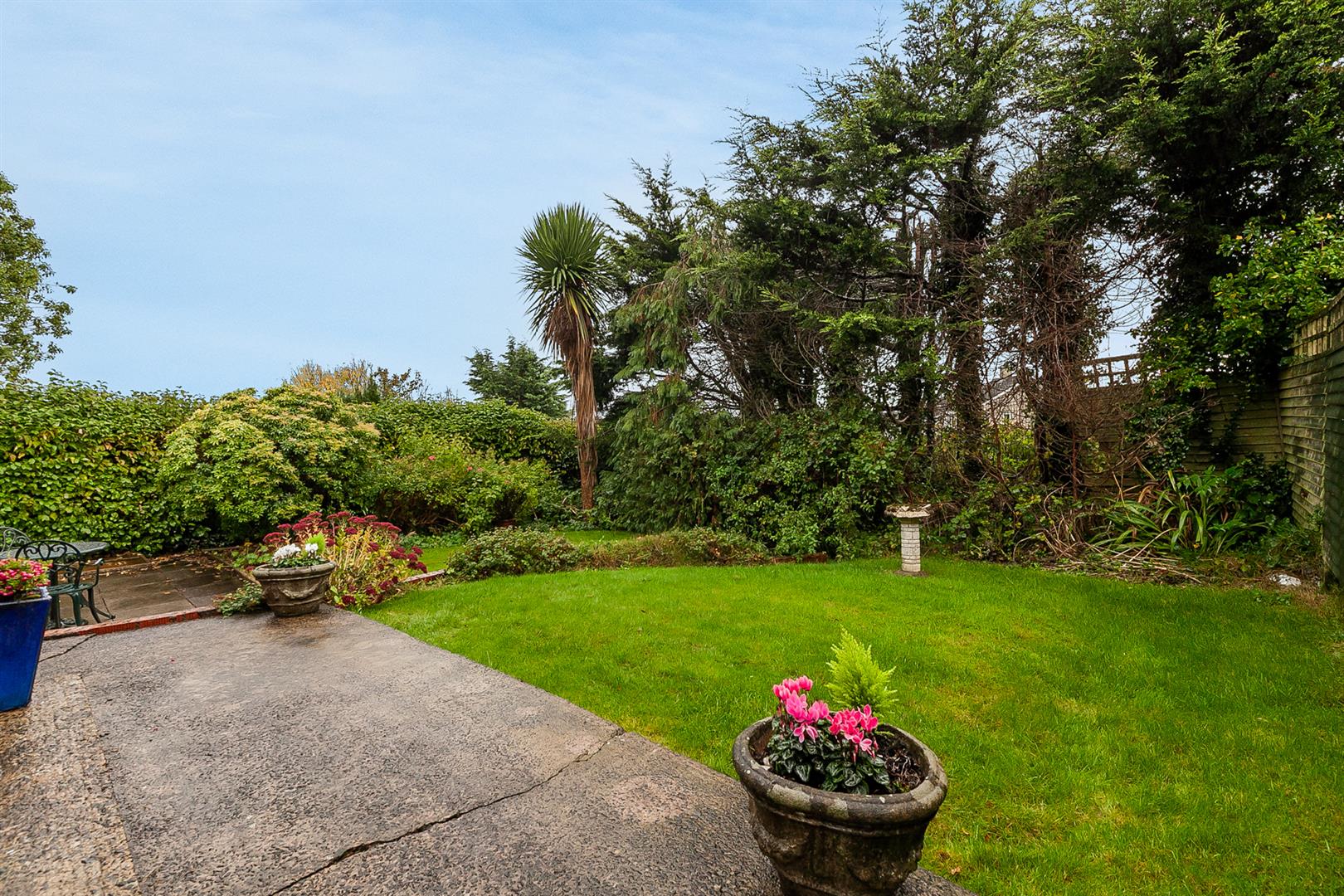 Paved patio areas, concrete and range of mature plants, trees and shrubbery.