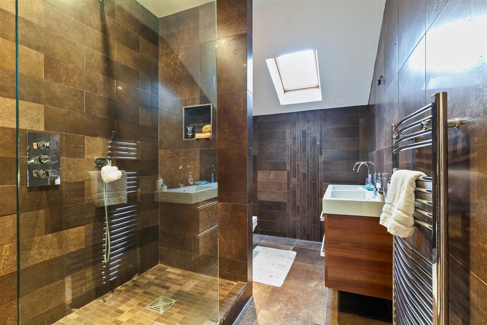 Contemporary, three piece suite comprising oversized, fully tiled shower enclosure, twin basin floating vanity unit and WC. Thermostat controlled mains shower unit. Chrome towel radiator.