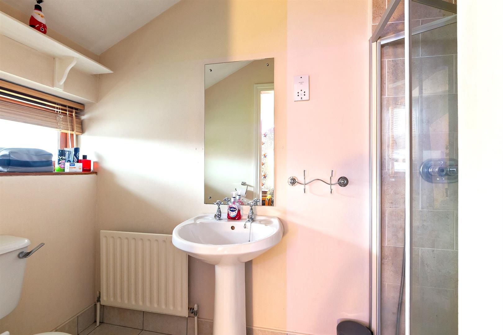 White, three piece suite comprising fully tiled shower enclosure, pedestal wash hand basin and WC. Thermostat controlled mains shower unit. Tiled floor.