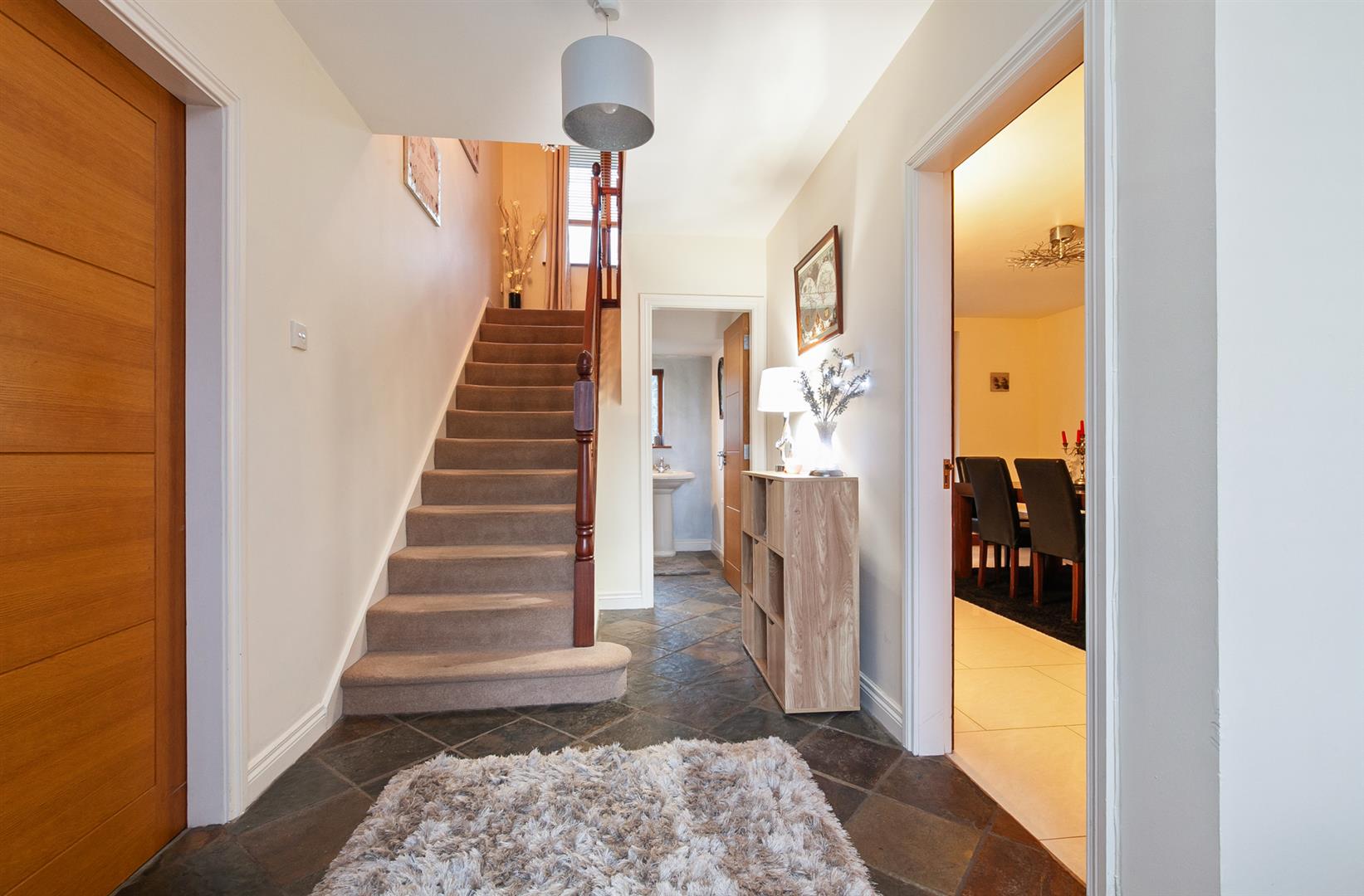 Hardwood, panelled front door with matching side screen and fanlight over. Chinese slate tile floor. Stairwell to first floor.
