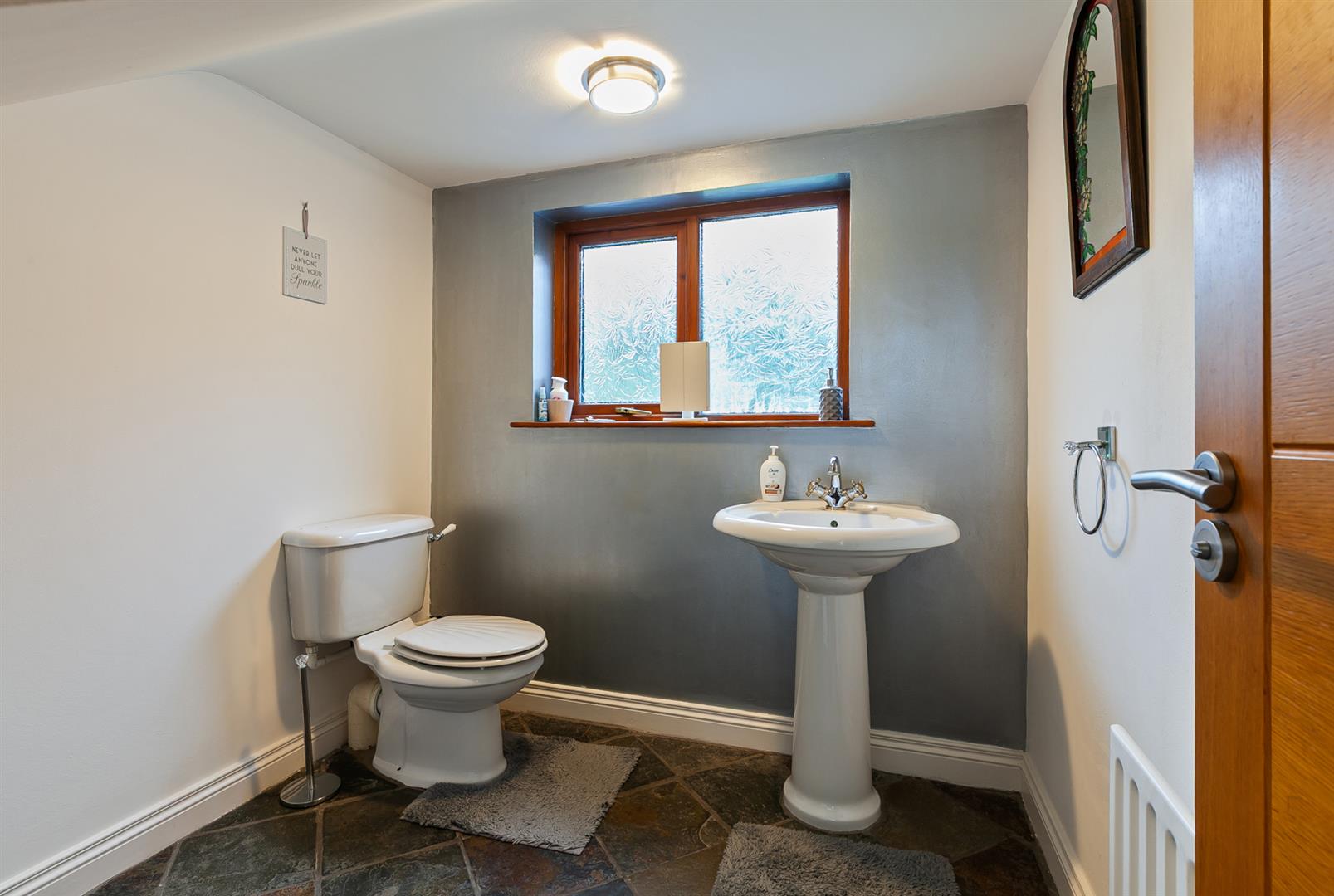 White, two piece suite comprising pedestal wash hand basin and WC. Chinese slate tile floor.