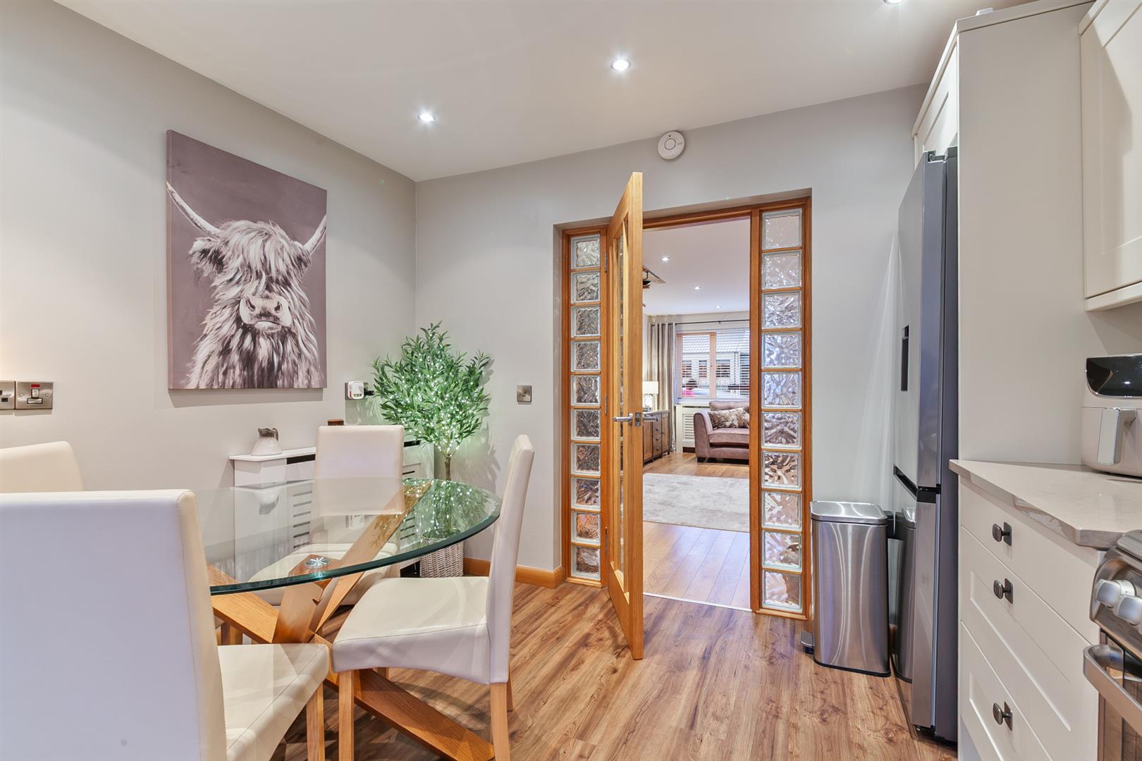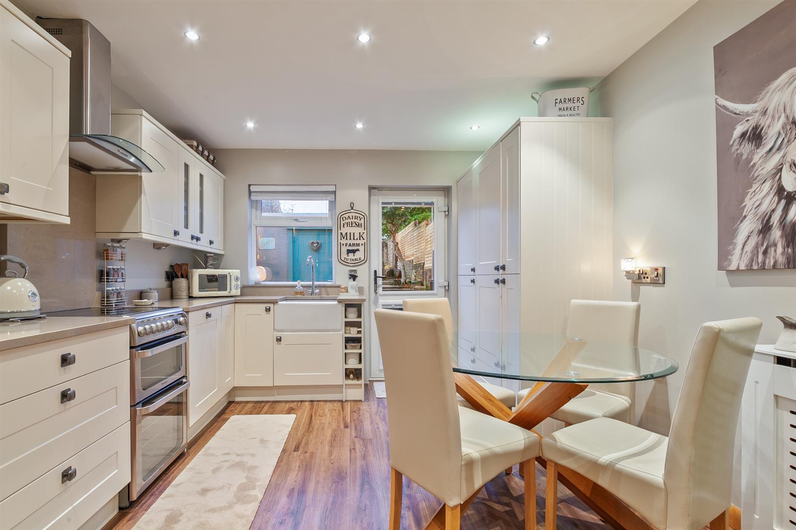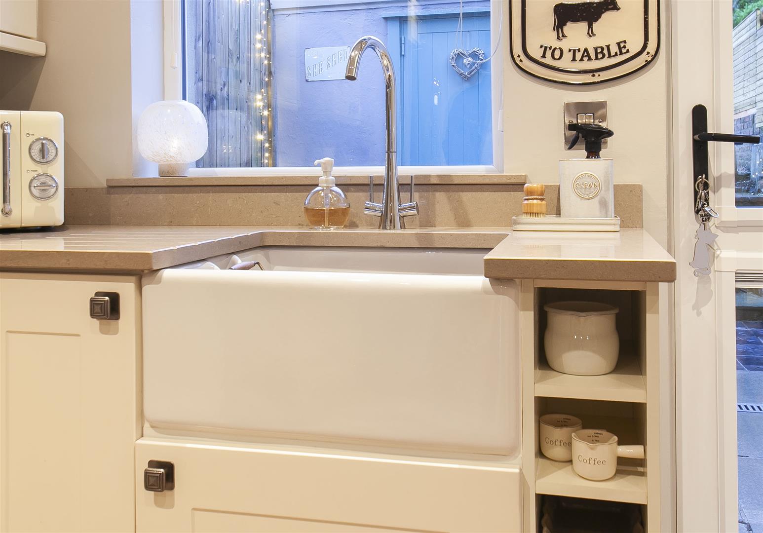 Luxury fitted kitchen with range of high and low level storage units with contrasting, solid quartz worktop. Ceramic Belfast sink. Cooker point with solid quartz splashback and extractor hood over. Space for fridge freezer. Integrated dishwasher. Gas fired central heating boiler (housed within matching unit). Solid quartz upstands to walls. Wood laminate floor covering. PVC double glazed door to rear garden.