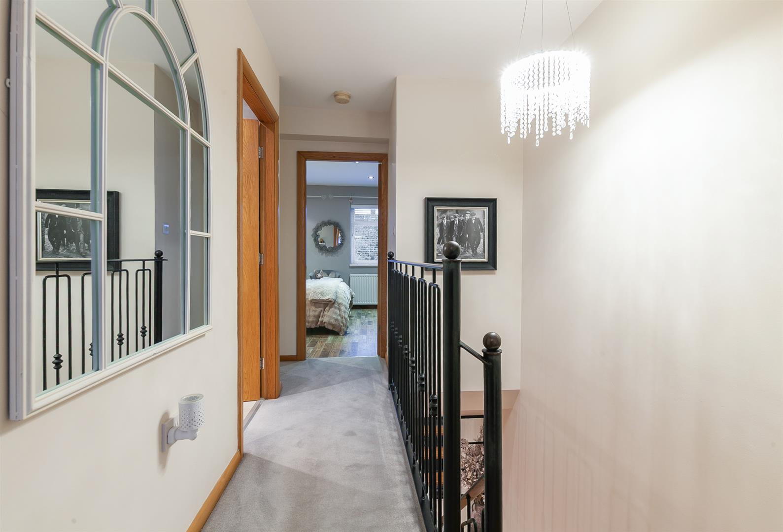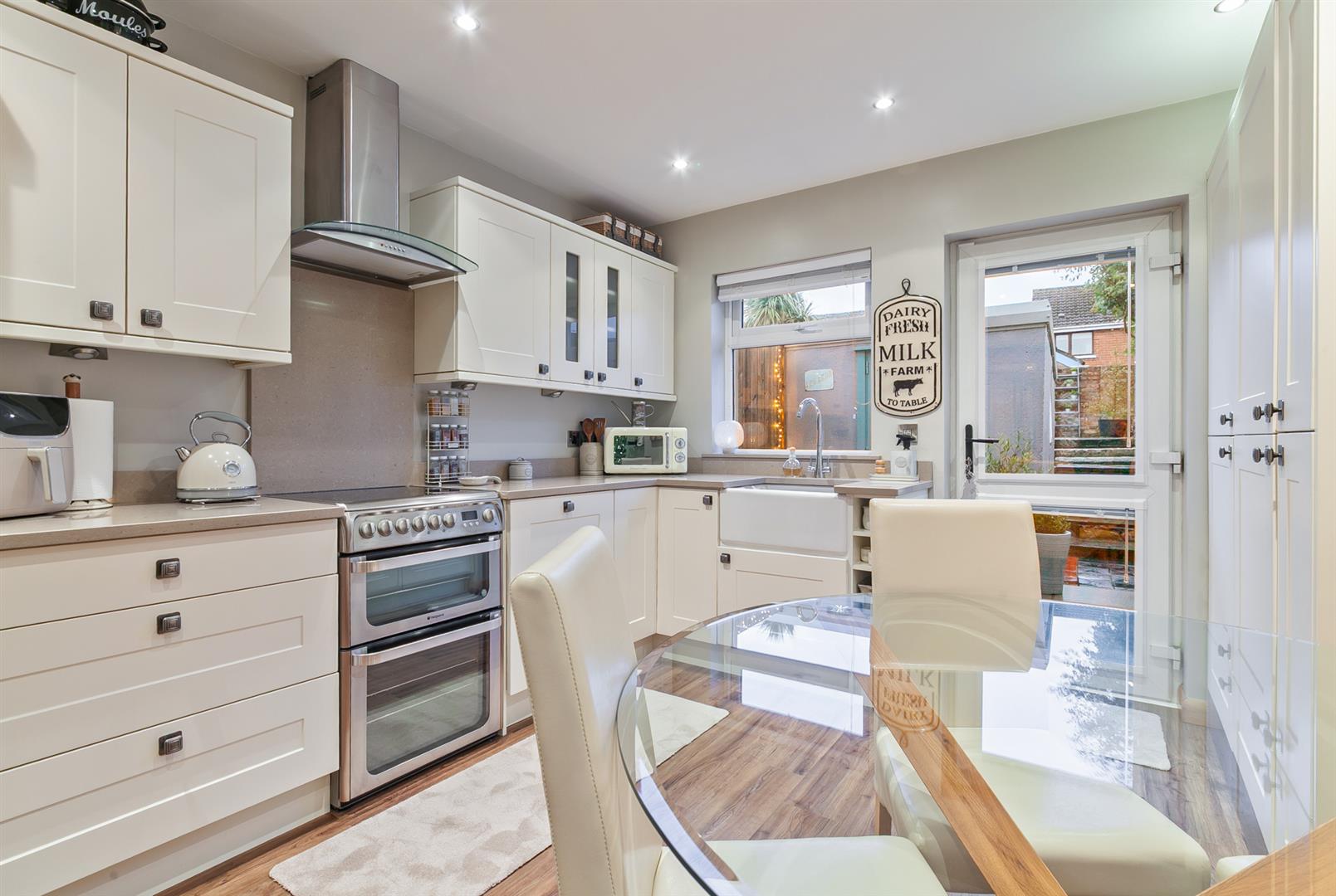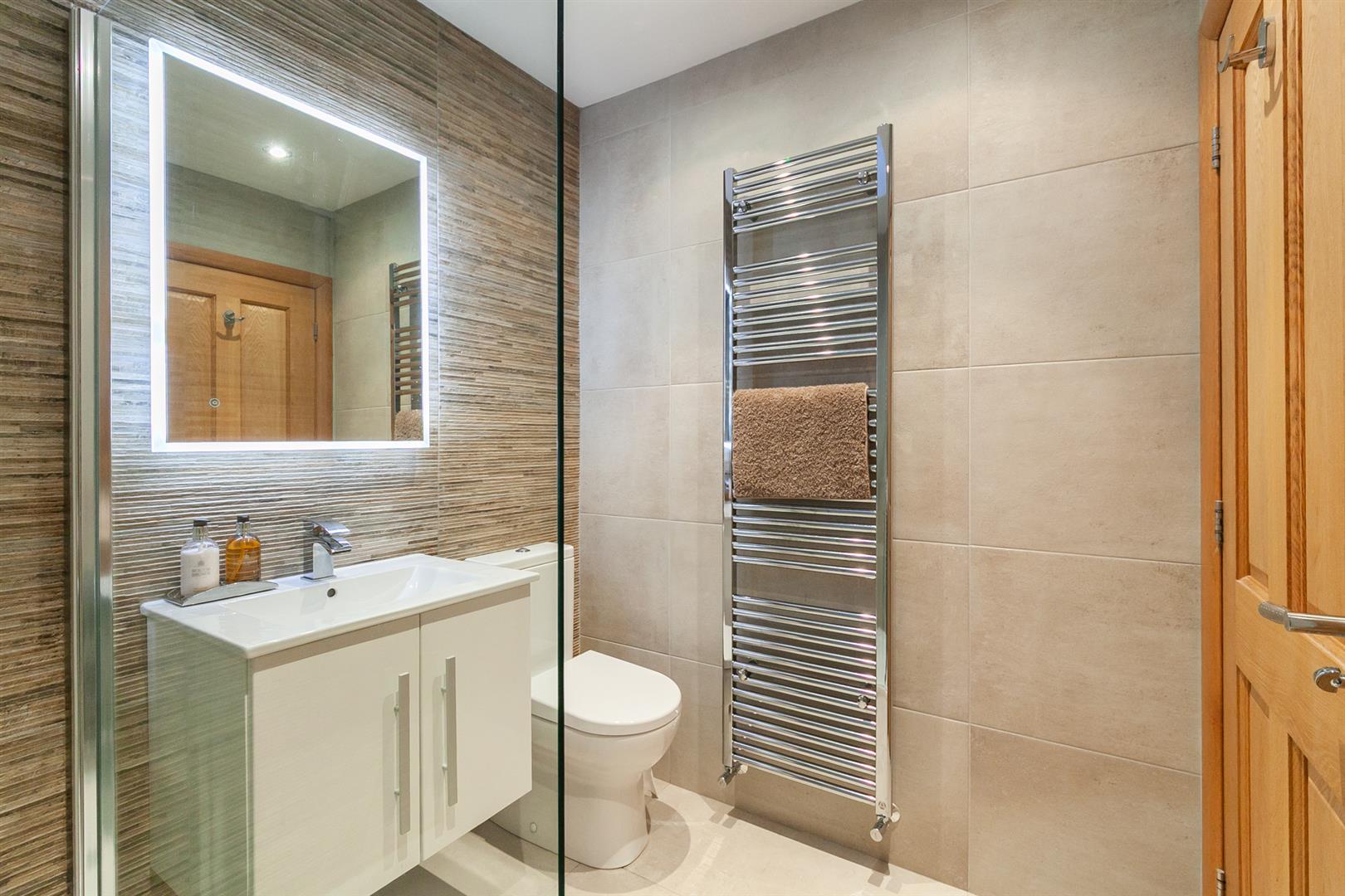 Luxury fitted kitchen with range of high and low level storage units with contrasting, solid quartz worktop. Ceramic Belfast sink. Cooker point with solid quartz splashback and extractor hood over. Space for fridge freezer. Integrated dishwasher. Gas fired central heating boiler (housed within matching unit). Solid quartz upstands to walls. Wood laminate floor covering. PVC double glazed door to rear garden.