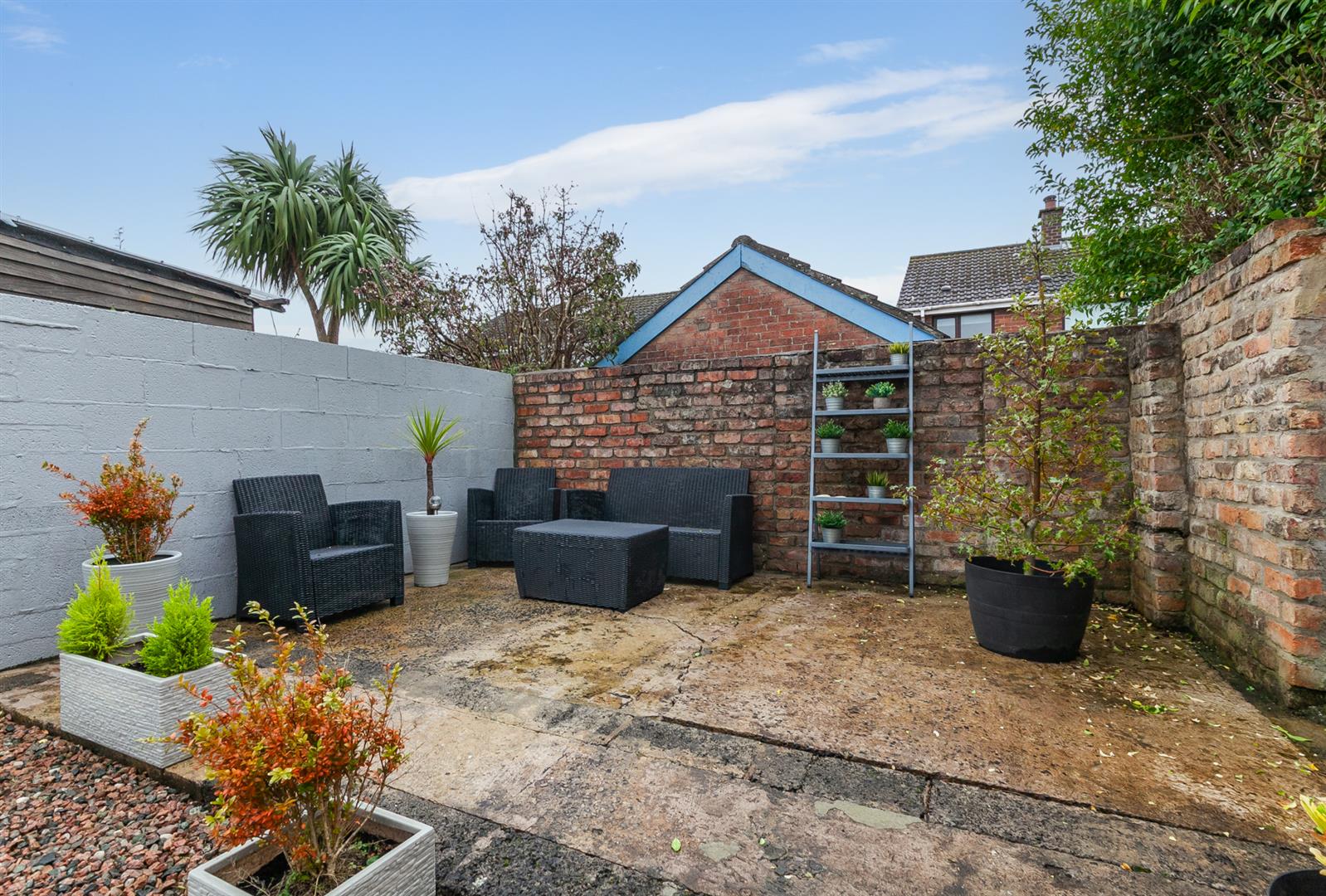 Fully enclosed rear garden finished in patio areas, decorative stone and mature tree.