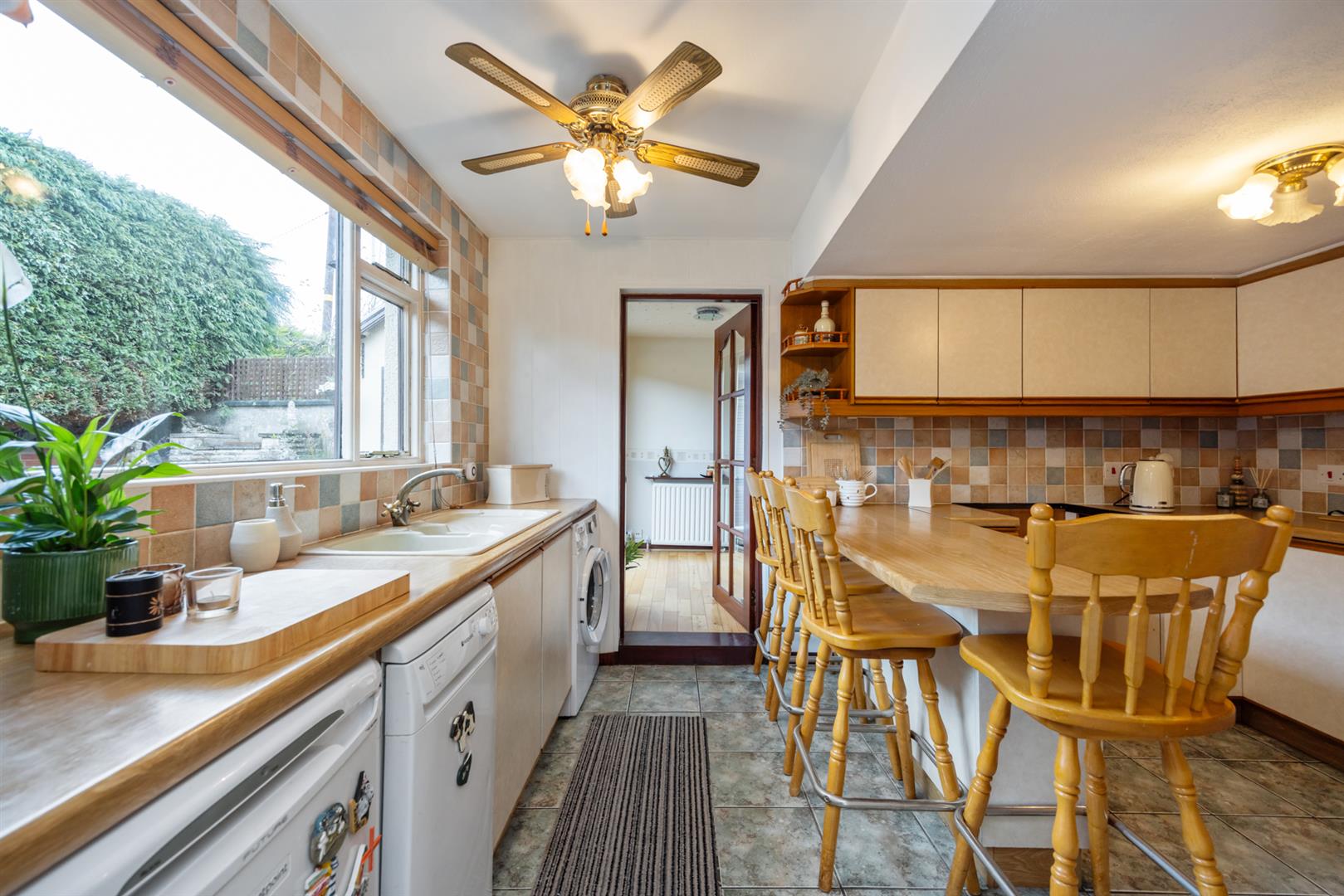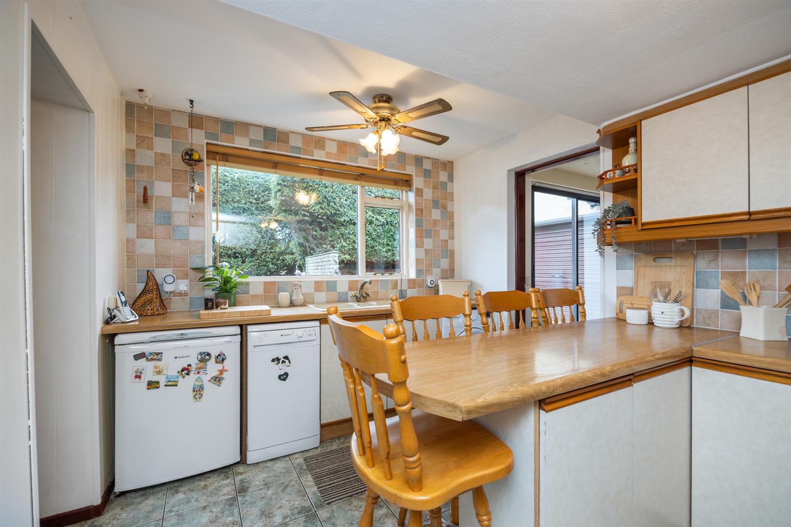 Fitted kitchen with range of high and low level storage units with contrasting, wood grain effect, melamine work surface. Matching breakfast bar area. Colour coded 1.5 bowl sink unit with draining bay. Cooker point. Plumbed and space for washing machine. Plumbed and space for dishwasher. Space for under counter fridge. Integrated microwave oven. Splashback tiling to walls. Tiled floor. Glass panelled door leading to: