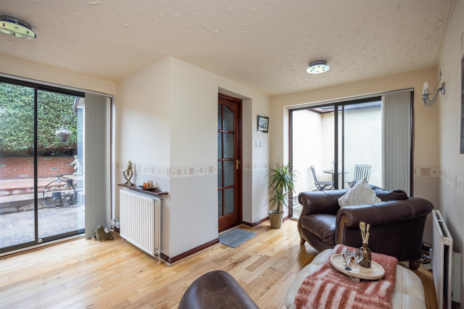 Aluminium framed, double glazed, sliding patio doors to side and rear. Timber flooring. Built in storage unit/bar. Glass panelled door leading to integral garage.